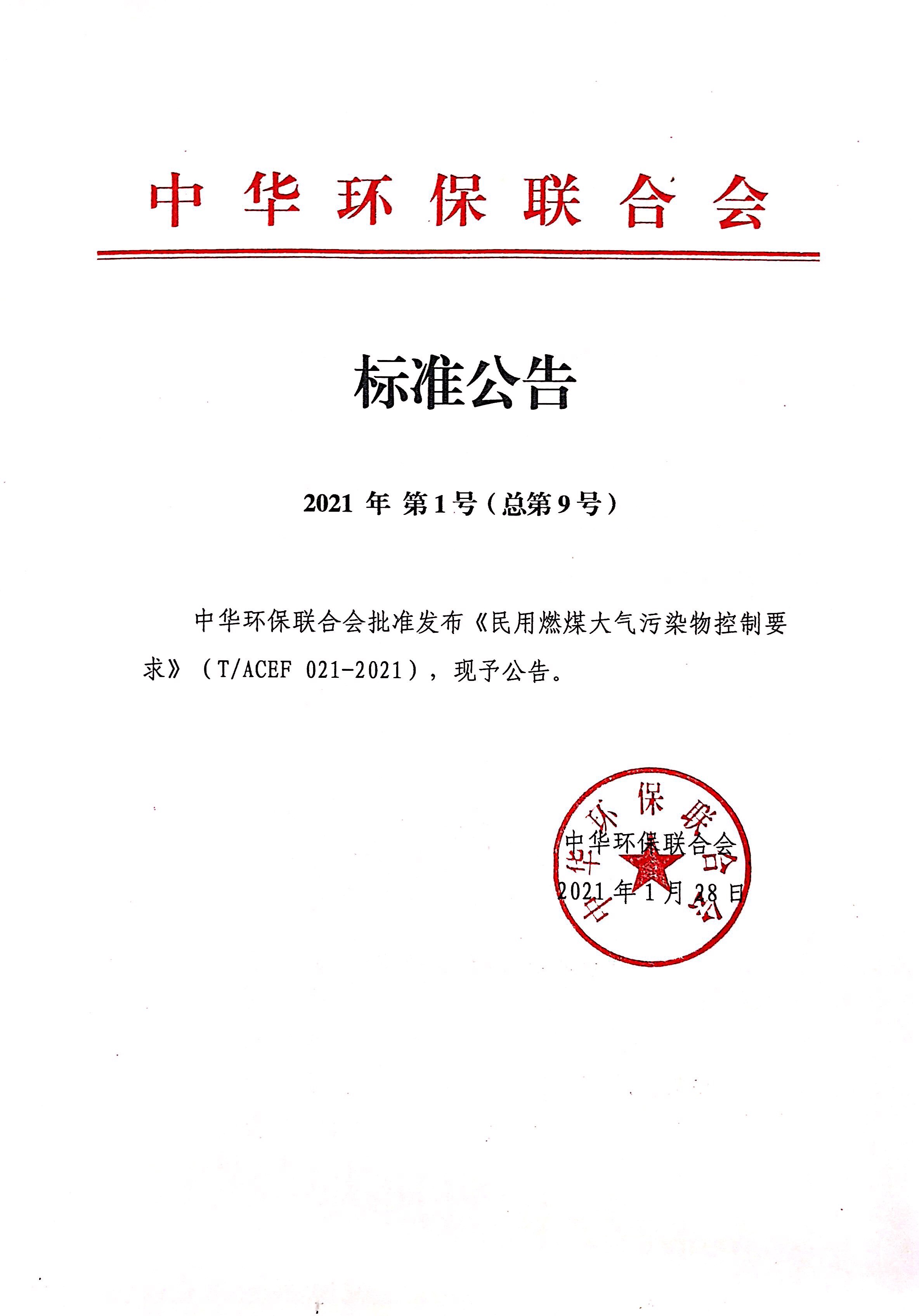 关于批准发布《民用燃煤大气污染物控制要求》团体标准的公告(2021 年 第 1号(总第9号))