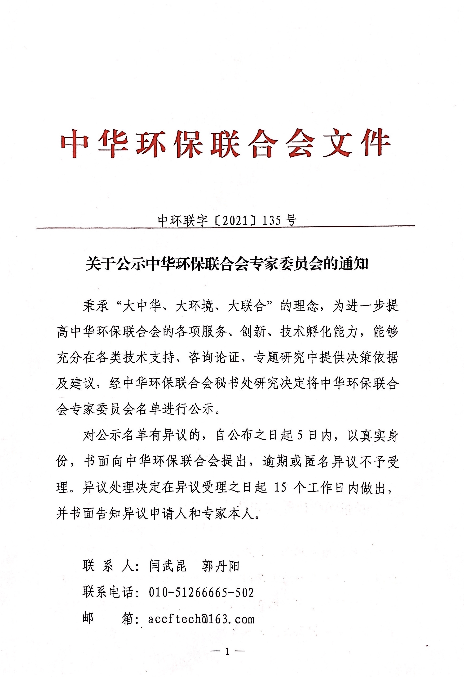 关于公示中华环保联合会专家委员会的通知