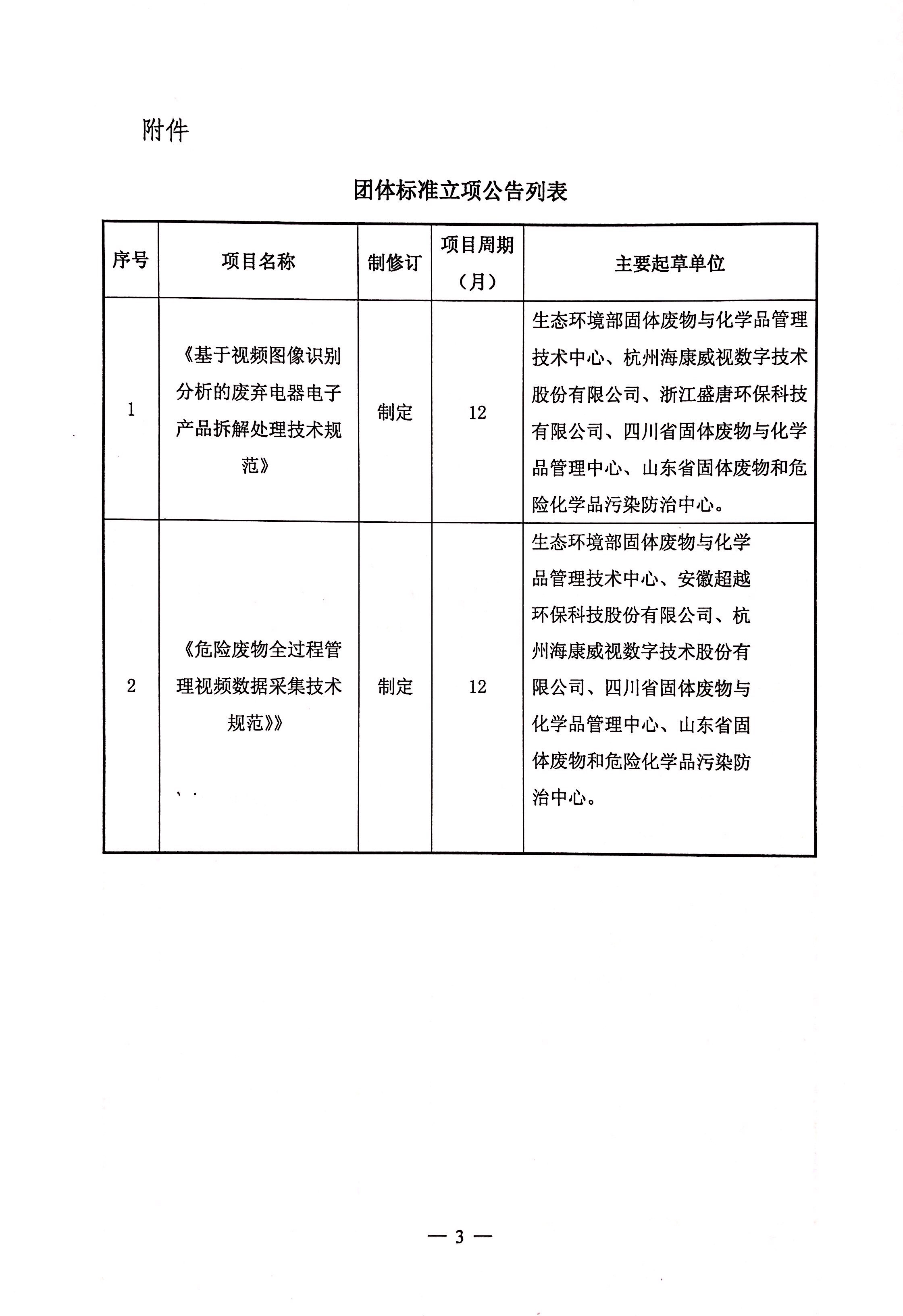 关于《基于视频图像识别分析的废弃电器电子产品拆解处理技术规范》与《危险废物全过程管理视频数据采集技术规范》 两项团体标准立项的公告