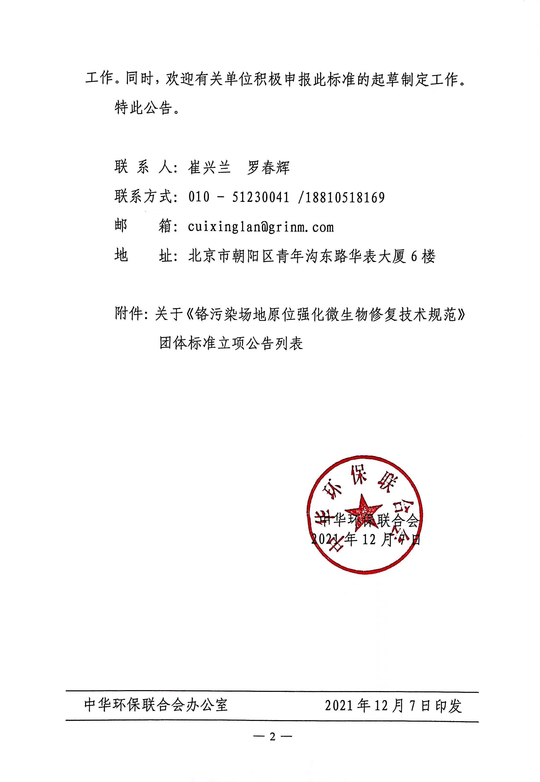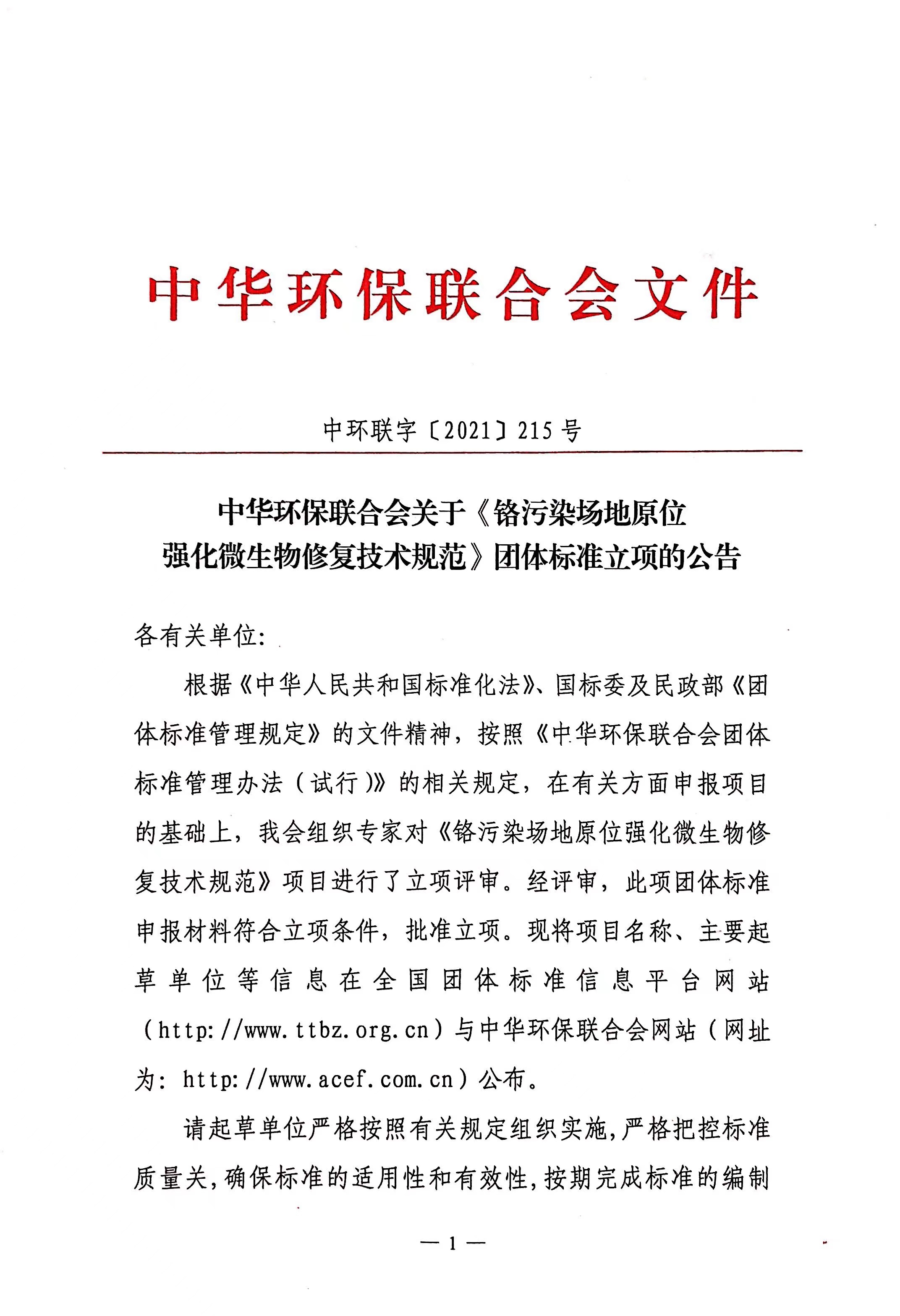 关于《铬污染场地原位强化微生物修复技术规范》团体标准立项的公告