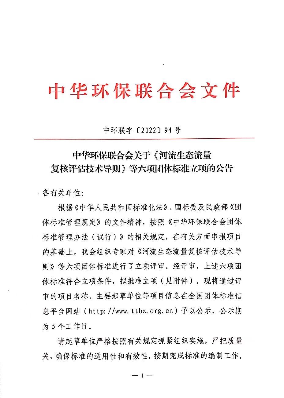 中华环保联合会关于《河流生态流量复核评估技术导则》等六项团体标准立项的公告