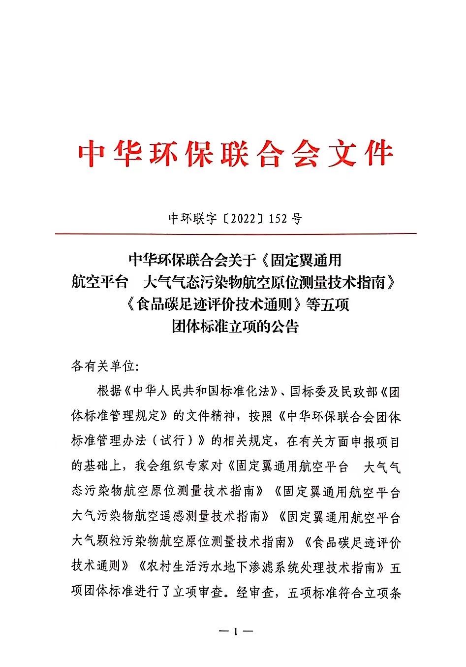 中华环保联合会关于《固定翼通用航空平台 大气气态污染物航空原位测量技术指南》《食品碳足迹评价技术通则》等五项团体标准立项的公告