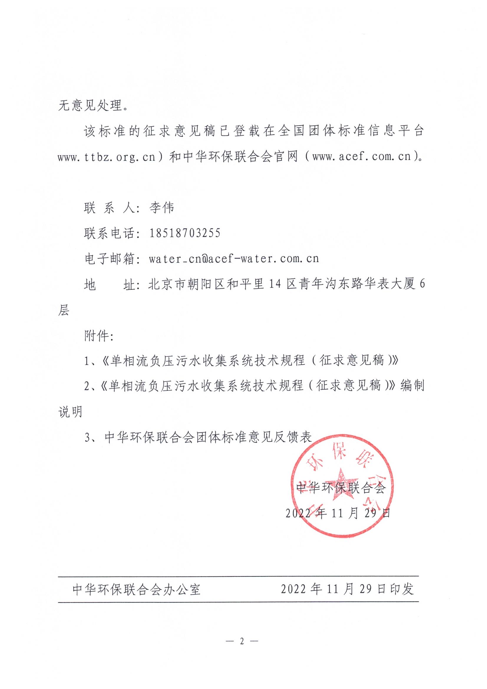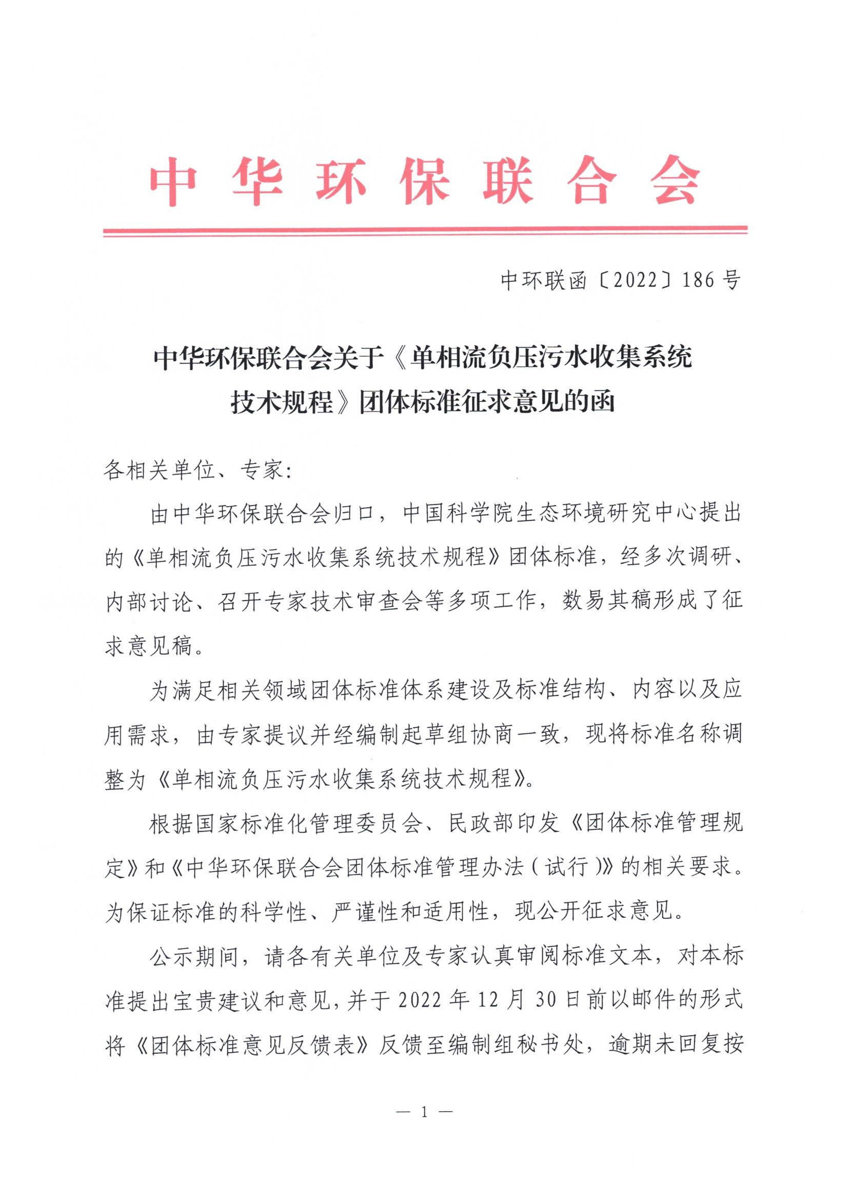 关于《单相流负压污水收集系统技术规程》团体标准征求意见的函