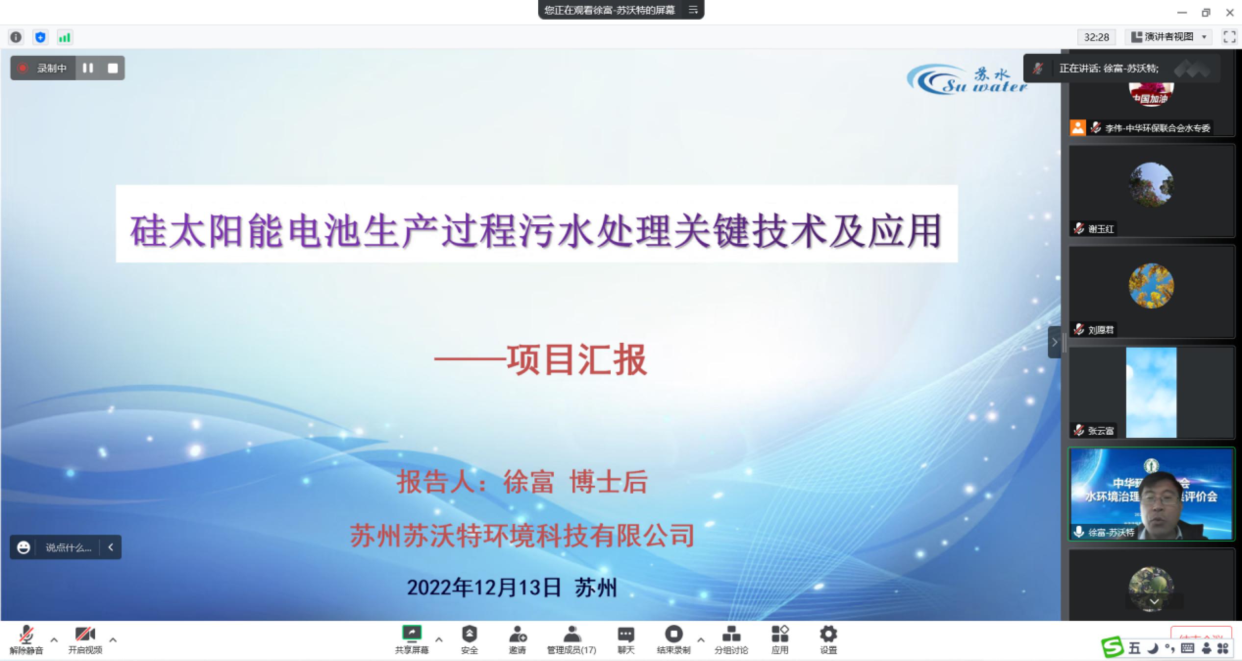 2022年12月13日,中华环保联合会按照科技成果评价的标准及程序,本着科学、独立、客观、公正的原则,以线上视频会议形式组织行业专家,对苏州苏沃特环境科技有限公司完成的“硅太阳能电池生产过程污水处理关键技术及应用”、上海凯鑫分离技术股份有限公司完成的“粘胶工业废碱高效回用及浓缩液回收系统”进行了科学技术成果评价。