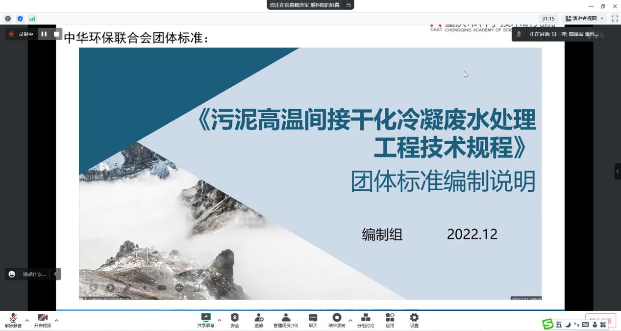 重庆市科学技术研究院魏泽军教授、国能龙源环保有限公司煤炭与化工事业部张鑫高工、技术部经理袁志丹分别代表主编单位对《村镇污水处理一体化集成装备技术指南》、《燃煤锅炉脱硫废水烟气余热浓缩干燥技术指南》、《污泥高温间接干化冷凝废水处理工程技术规程》编制情况进行了汇报,并就标准征求意见稿公开征求意见情况进行重点介绍。