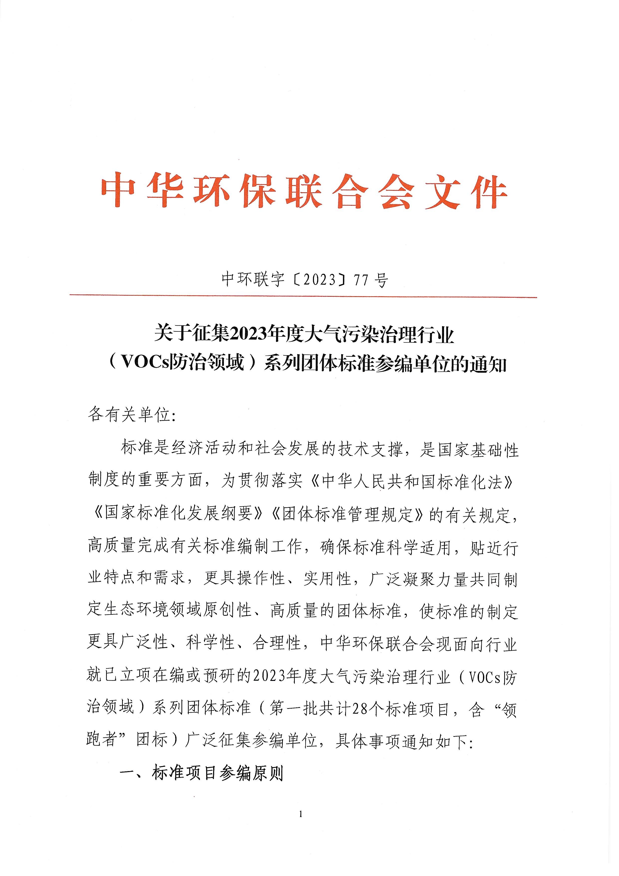 关于征集2023年度大气污染治理行业(VOCs防治领域)系列团体标准参编单位的通知