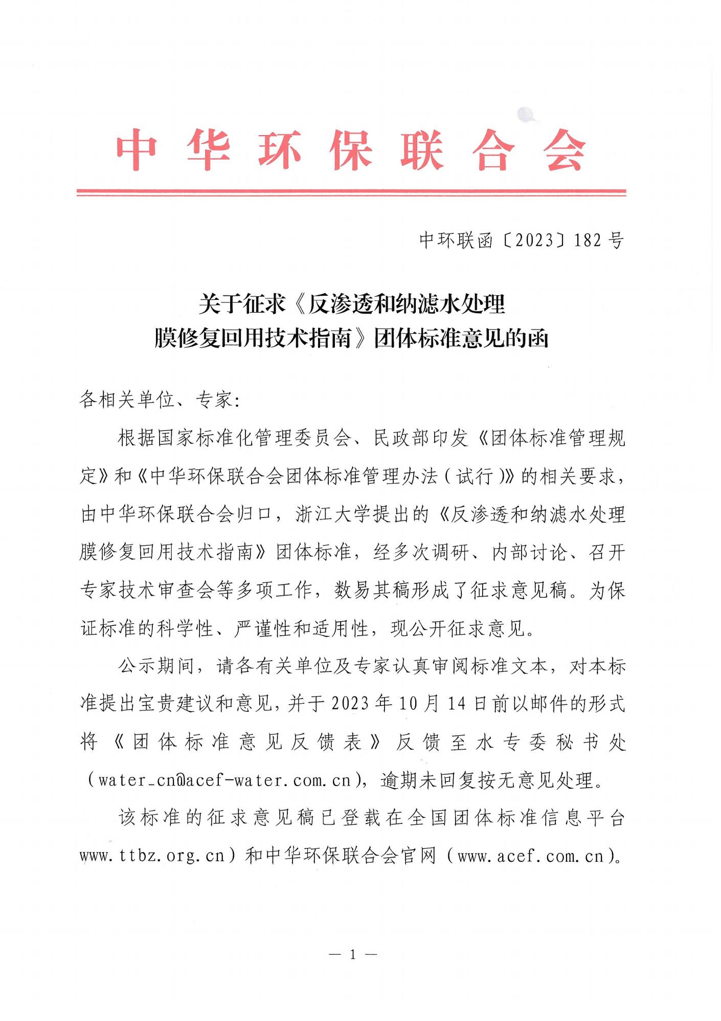关于公开征求《反渗透和纳滤水处理膜修复回用技术指南》团体标准意见的函