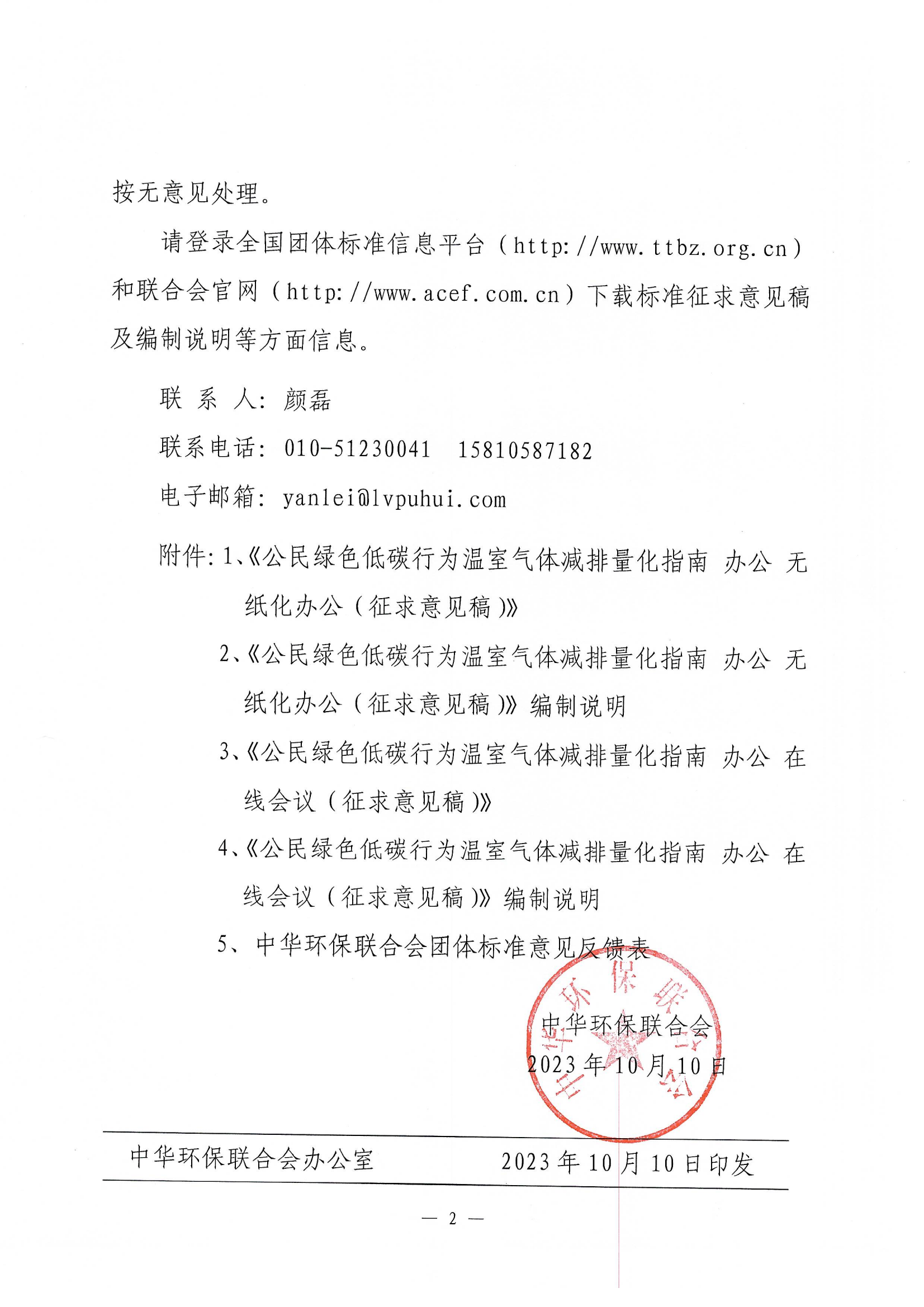 关于《公民绿色低碳行为温室气体减排量化指南 办公 无纸化办公》《公民绿色低碳行为温室气体减排量化指南 办公 在线会议》两项团体标准征求意见的函
