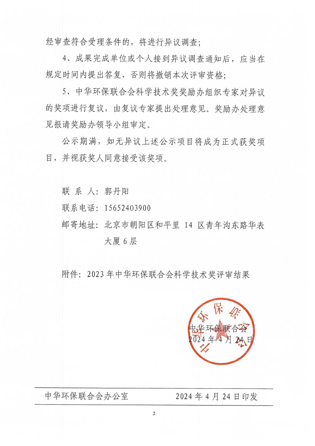 中华环保联合会关于公示2023年度科学技术奖评审结果的公告