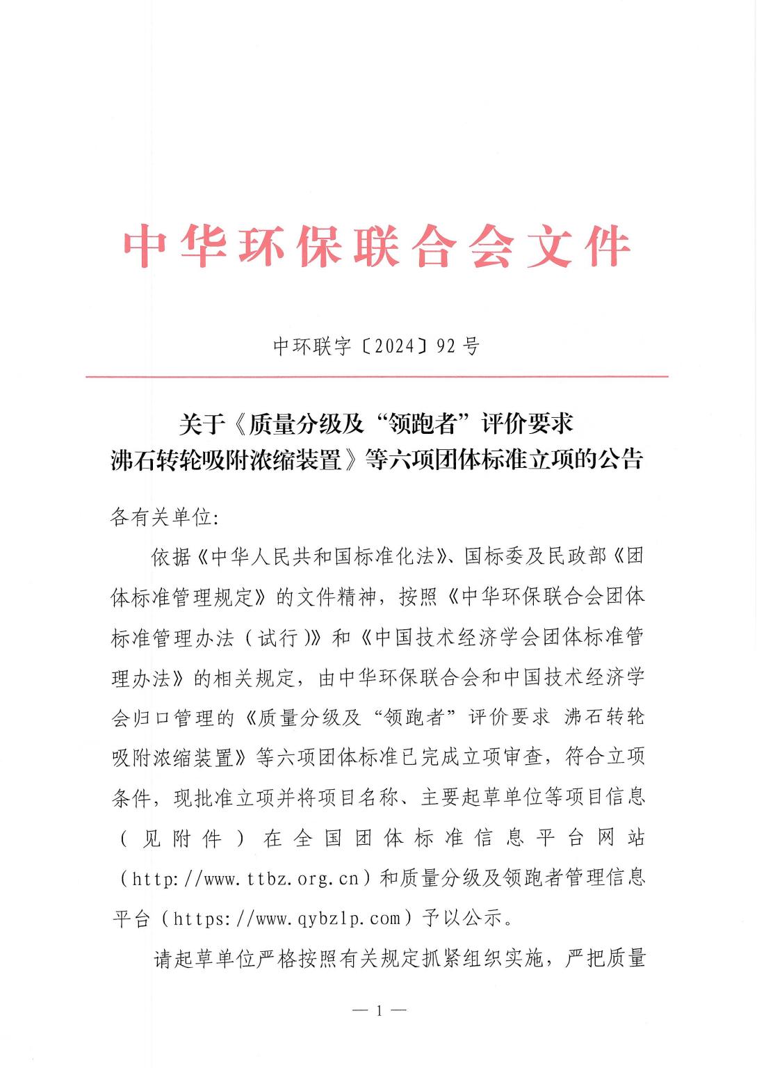 关于《质量分级及“领跑者”评价要求 沸石转轮吸附浓缩装置》等六项团体标准立项的公告