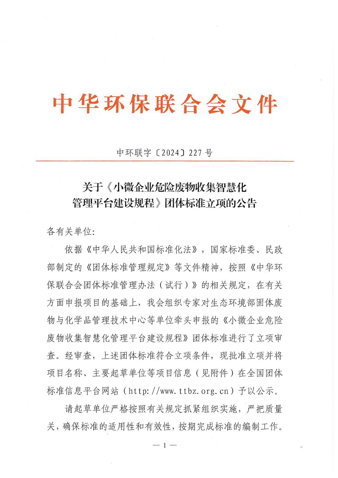 关于《小微企业危险废物收集智慧化管理平台建设规程》团体标准立项的公告