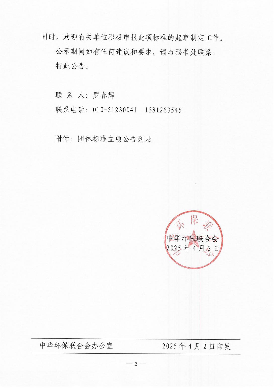 关于开展 2025年度中华环保联合会