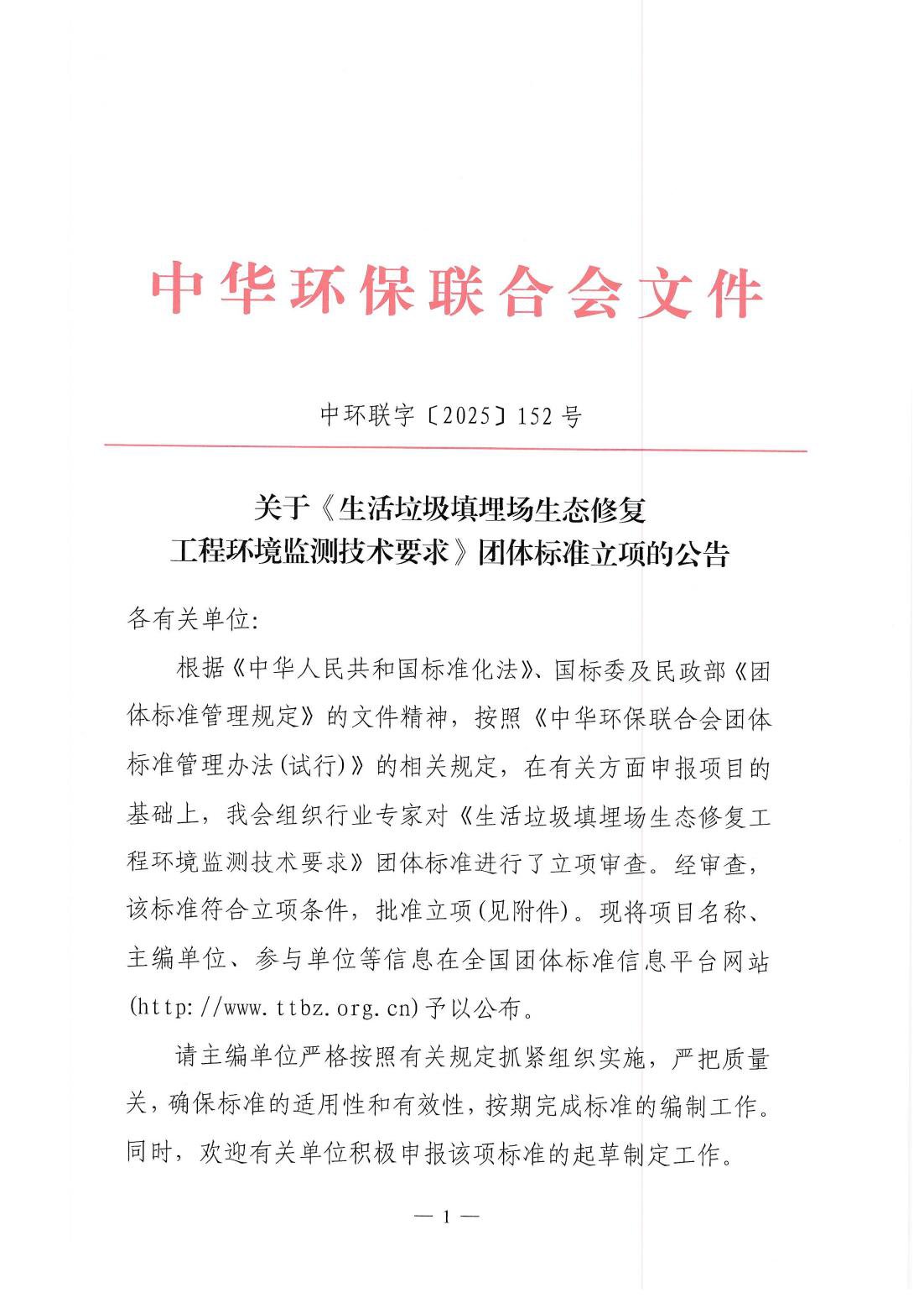 关于《生活垃圾填埋场生态修复工程环境监测技术要求》团体标准立项的公告