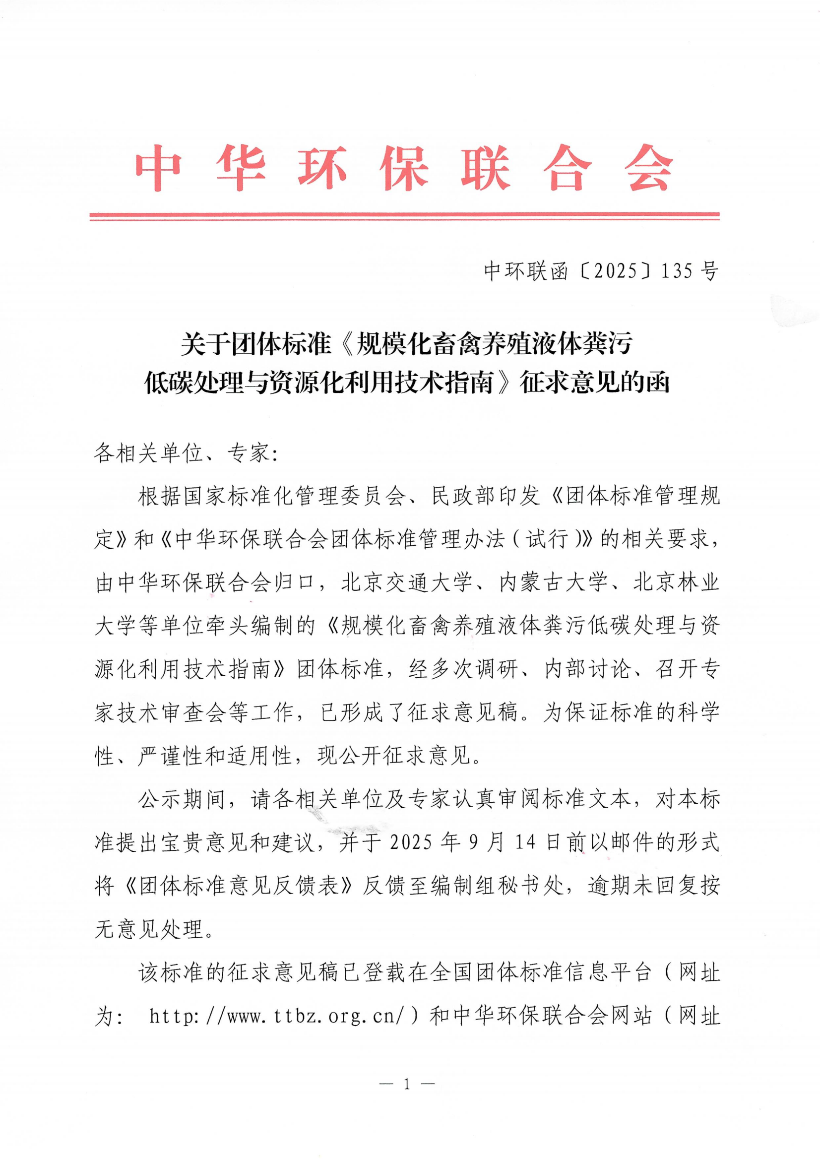 关于团体标准《规模化畜禽养殖液体粪污低碳处理与资源化利用技术指南》征求意见的函