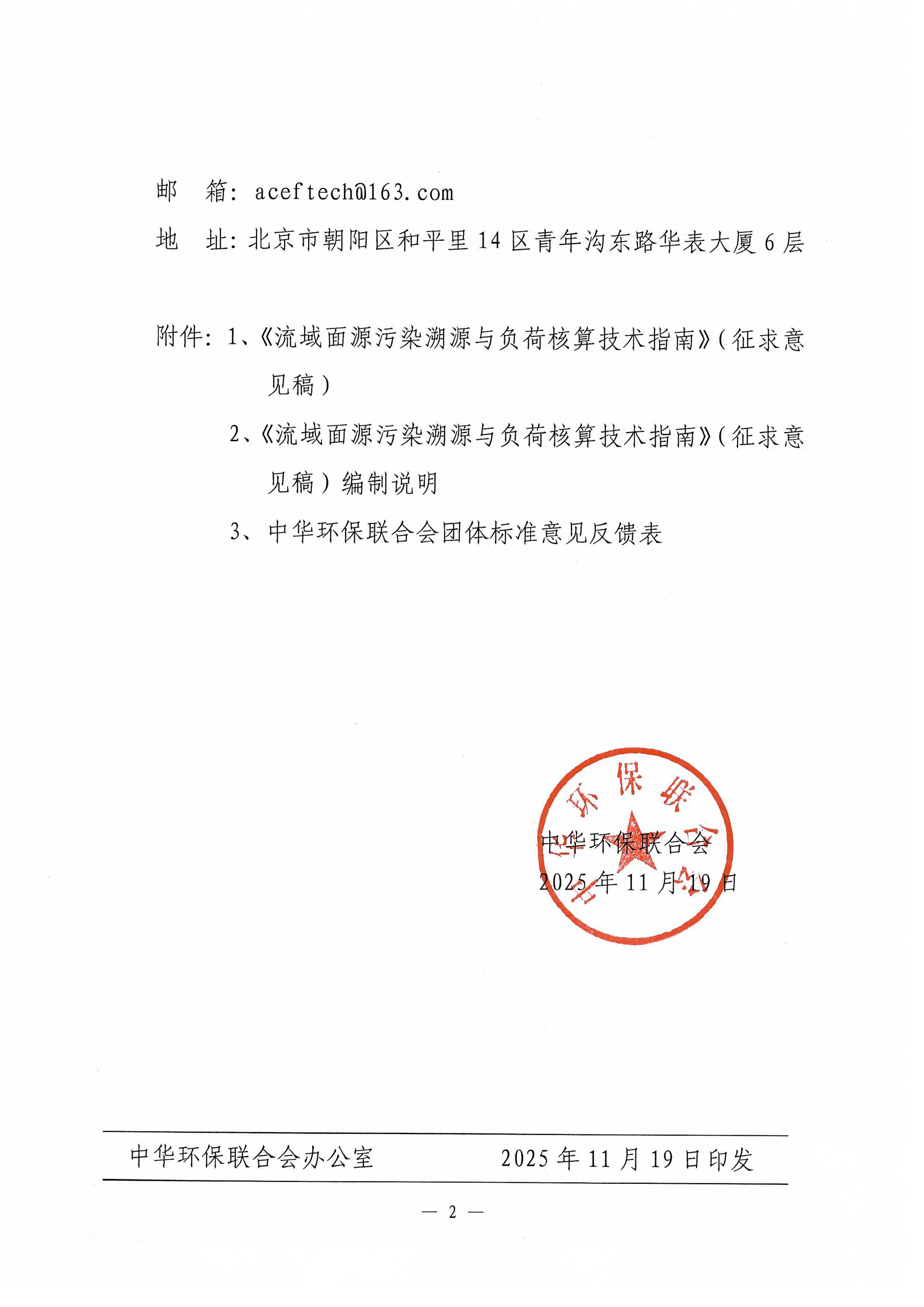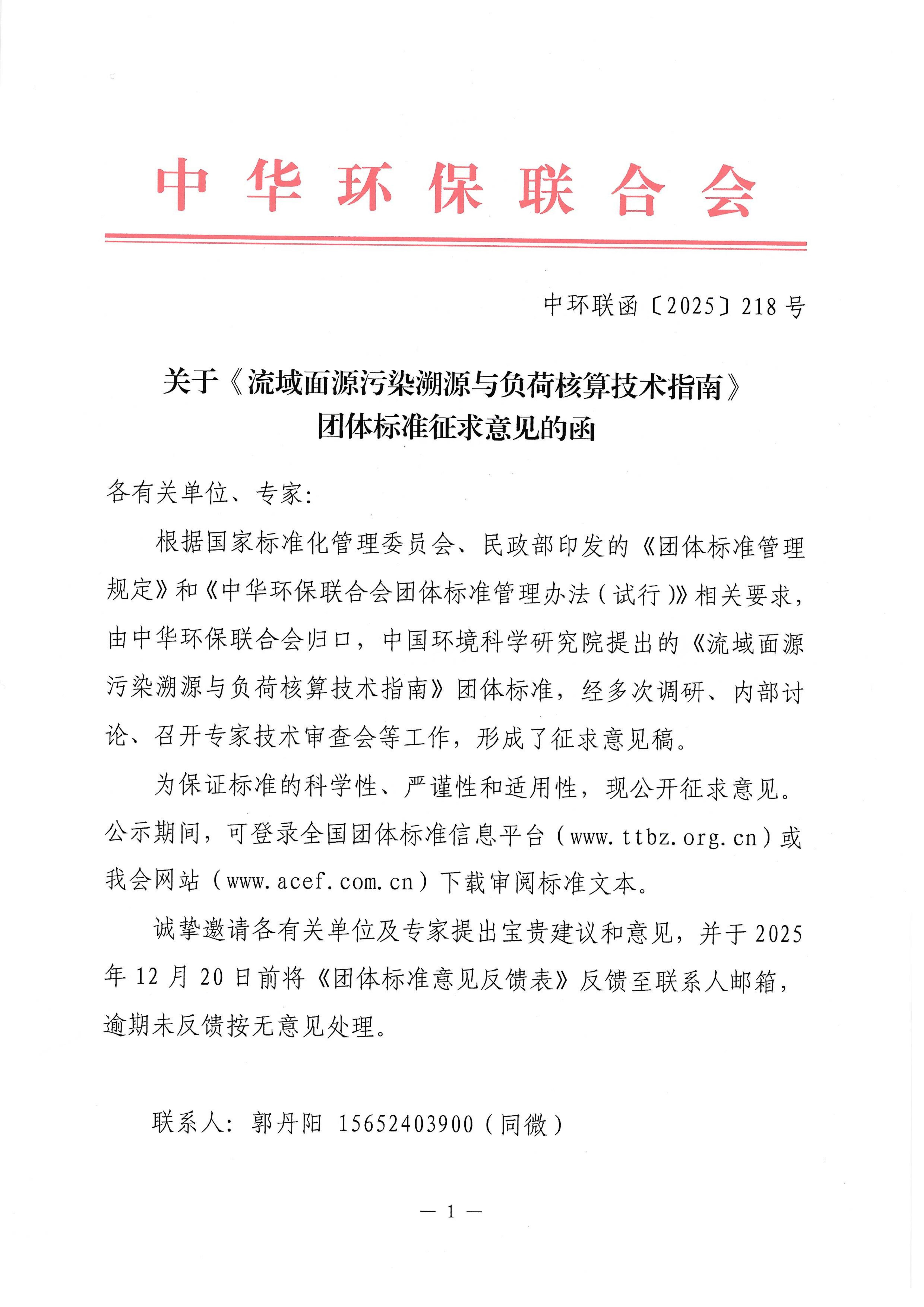 关于《流域面源污染溯源与负荷核算技术指南》团体标准征求意见的函