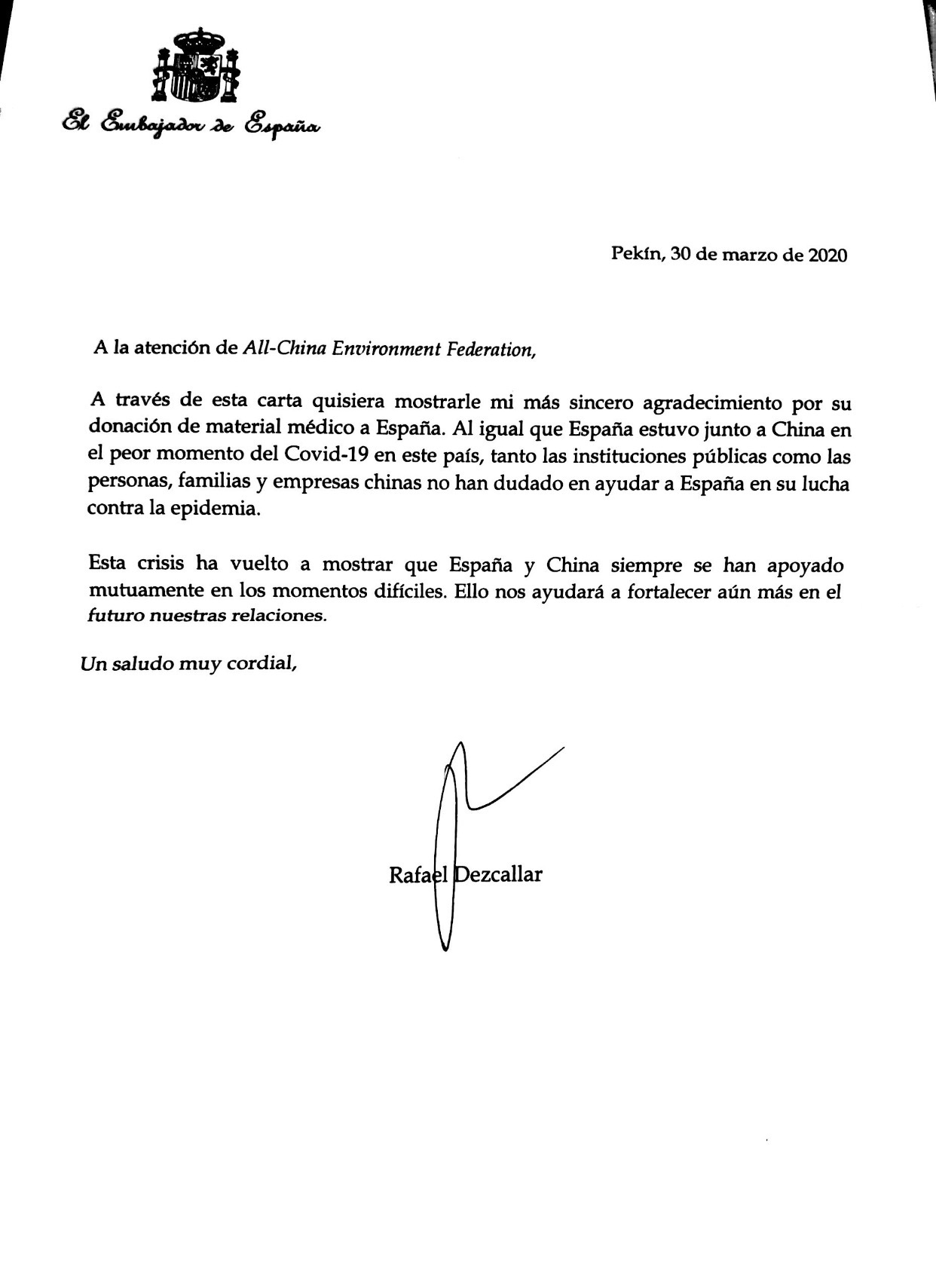 德斯卡利亚尔大使向中华环保联合会致感谢信