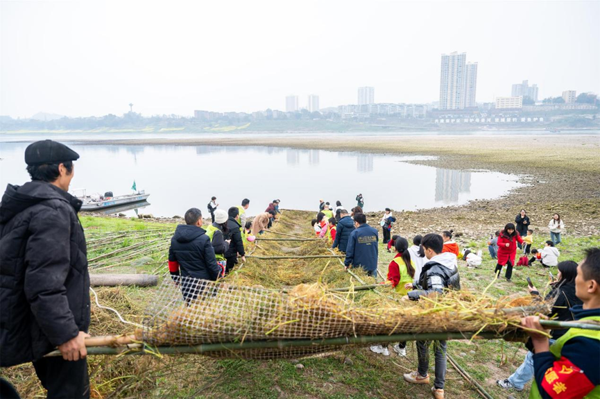 砍竹子、铺兜网、扎铁丝、铺水游草、加横杆……经过近一个小时的努力,人工鱼巢顺利完成。众人齐动手,将人工鱼巢移入长江的浅滩水域,并在江津鸿鹄护鱼队巡护员的协助下,利用巡护船将其送至产卵场。