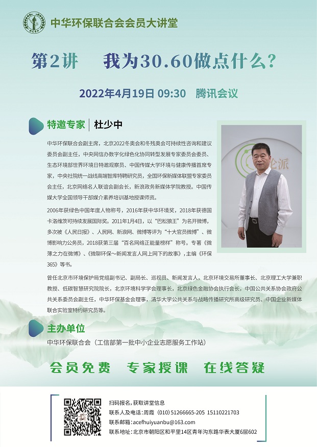 为更好的服务于会员企业,进一步搭建会员企业沟通交流的平台,助力会员企业发展,发挥中华环保联合会作为工信部第一批中小企业志愿服务工作站的作用,4月19日09:30,以线上视频形式(腾讯会议)举办“中华环保联合会会员大讲堂”第二讲。