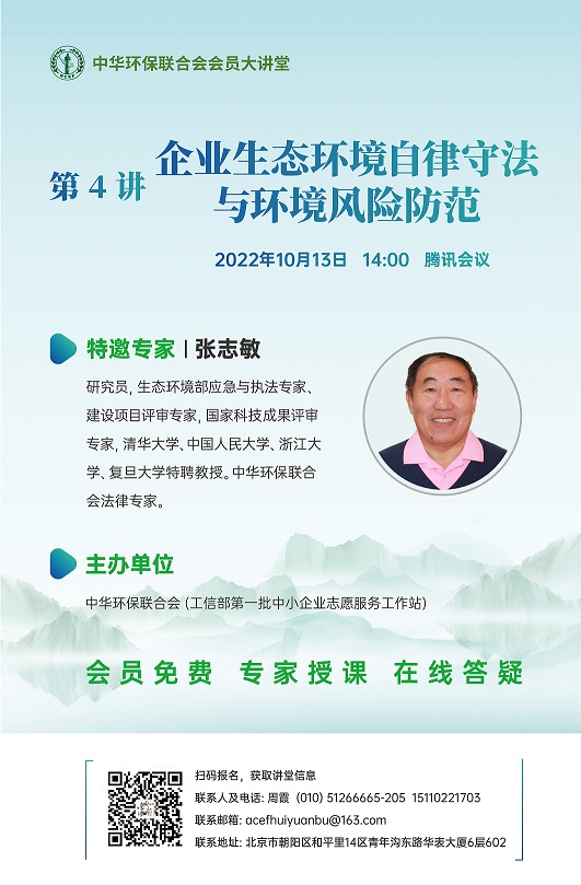 为更好的服务于会员企业,进一步搭建会员企业沟通交流的平台,助力会员企业发展,发挥中华环保联合会作为工信部第一批中小企业志愿服务工作站的作用,10月13日14:00,以线上视频形式(腾讯会议)举办“中华环保联合会会员大讲堂”第四讲。