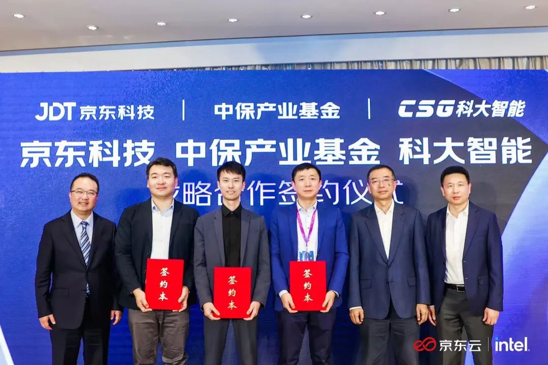 科大智能董事长黄明松先生,与京东集团副总裁、京东云总裁高礼强先生、信保基金总经理迟为国先生,共同出席见签战略合作签约仪式。