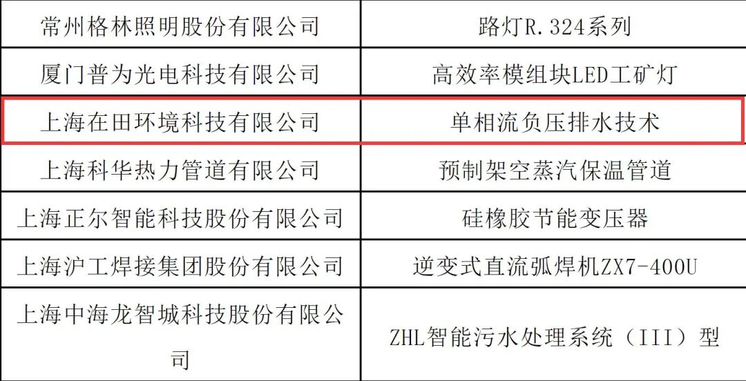 近日,上海市能效中心(上海市产业绿色发展促进中心)发布了2021-2022年度“上海市节能减排技术产品”名单,上海在田科技“单相流负压排水技术”在生活污水收集处理过程中,以优异的成绩成功入围“节能减排技术产品”。