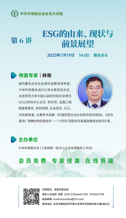 为更好的服务于会员企业,进一步搭建会员企业沟通交流的平台,助力会员企业发展,发挥中华环保联合会作为工信部第一批中小企业志愿服务工作站的作用,7月19日14:00,以线上视频形式(腾讯会议)举办“中华环保联合会会员大讲堂”第六讲。