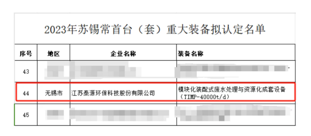 近日,2023年苏锡常首台(套)重大装备拟认定名单公示,江苏泰源环保科技股份有限公司(以下简称泰源环保)“模块化装配式废水处理与资源化成套设备(TIMP-40000t/d)”成功入选,实现重大技术突破,为推动环保产业标准化、高端化、智能化、绿色化发展发挥重要作用,是本年度