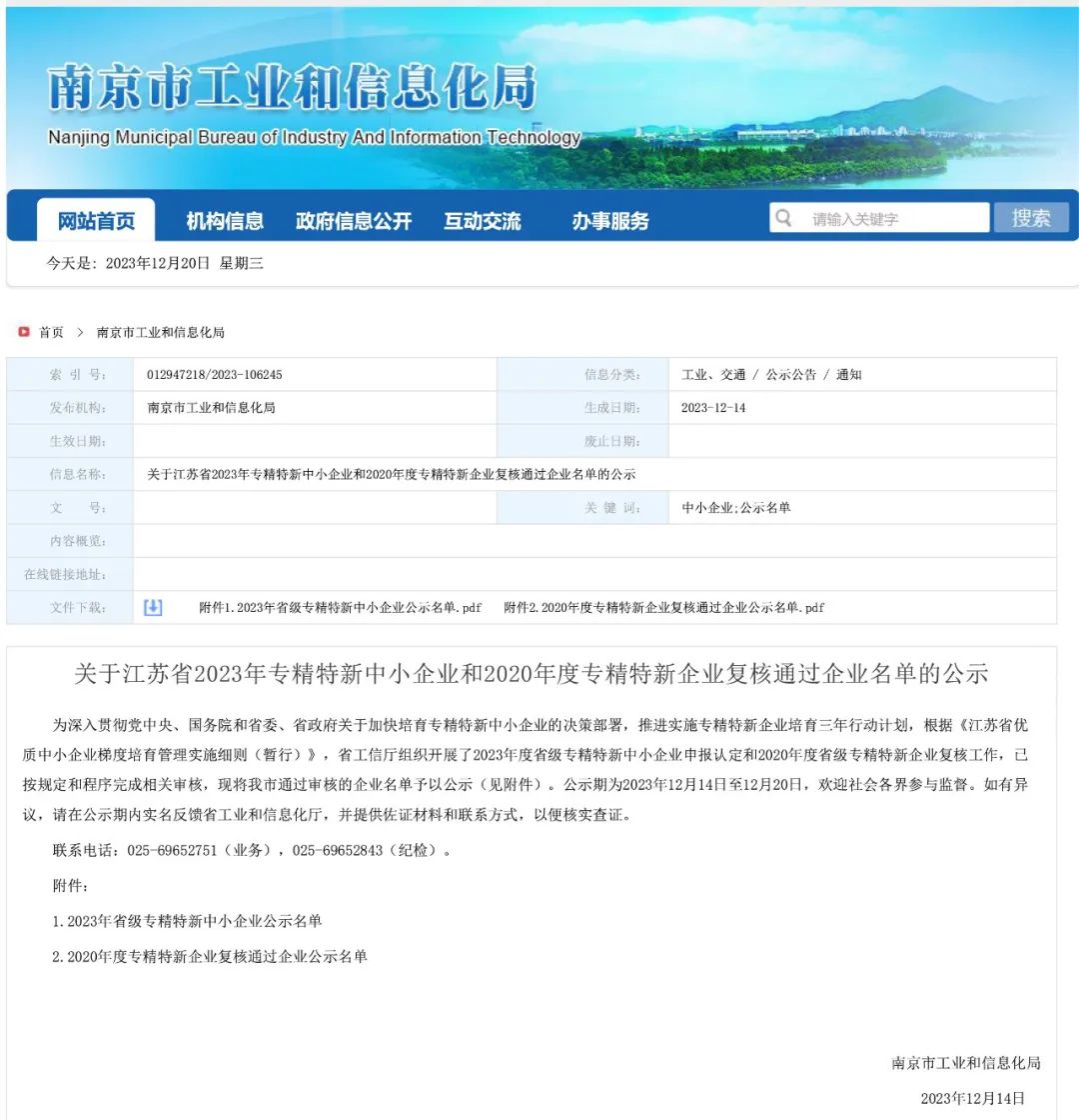 12月14日,江苏省工业和信息化厅发布《关于江苏省2023年专精特新中小企业和2020年度专精特新企业复核通过企业名单的公示》,江苏南大环保科技有限公司成功入选2023年江苏省省级专精特新中小企业名单。