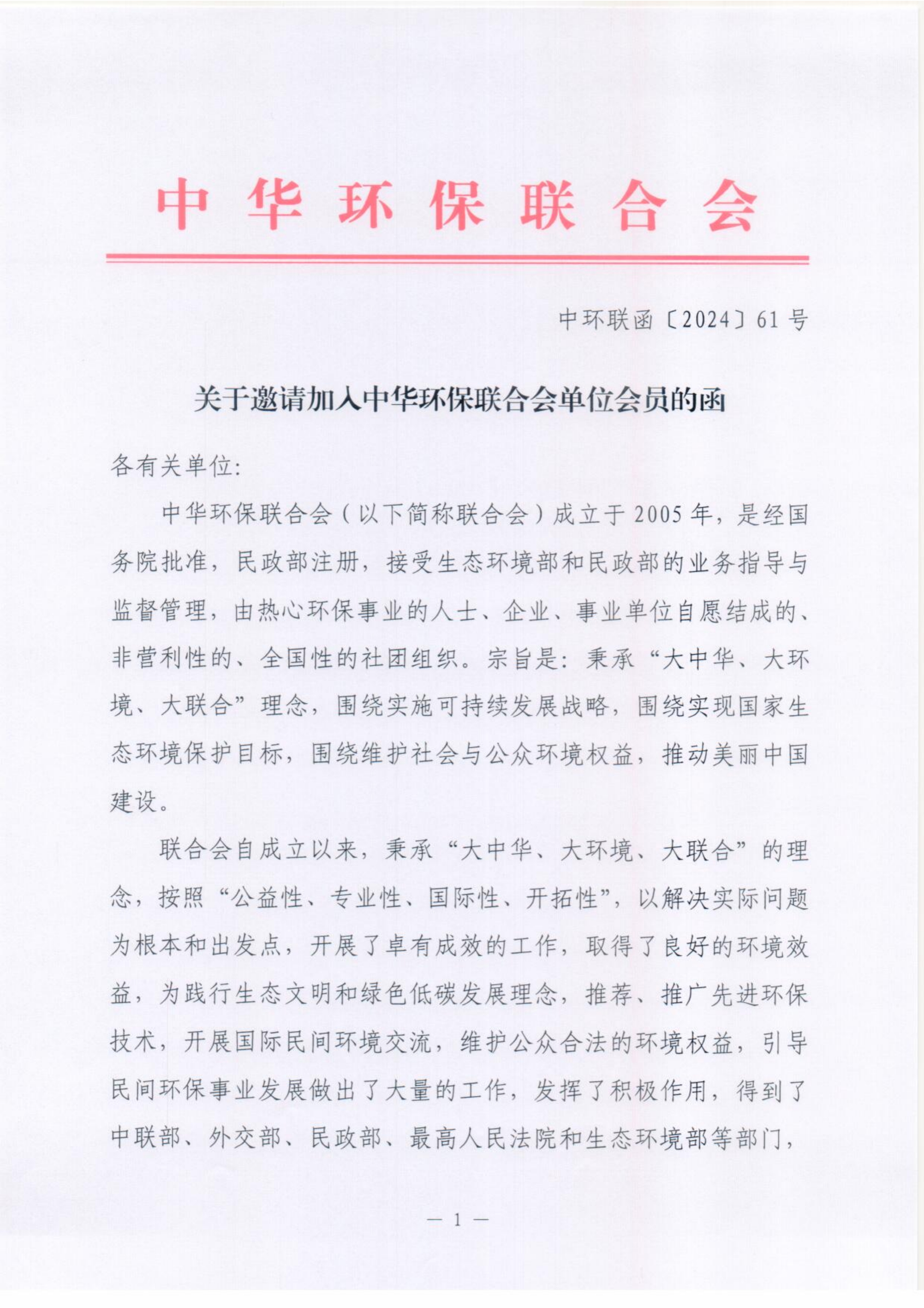 关于邀请加入中华环保联合会单位会员的函