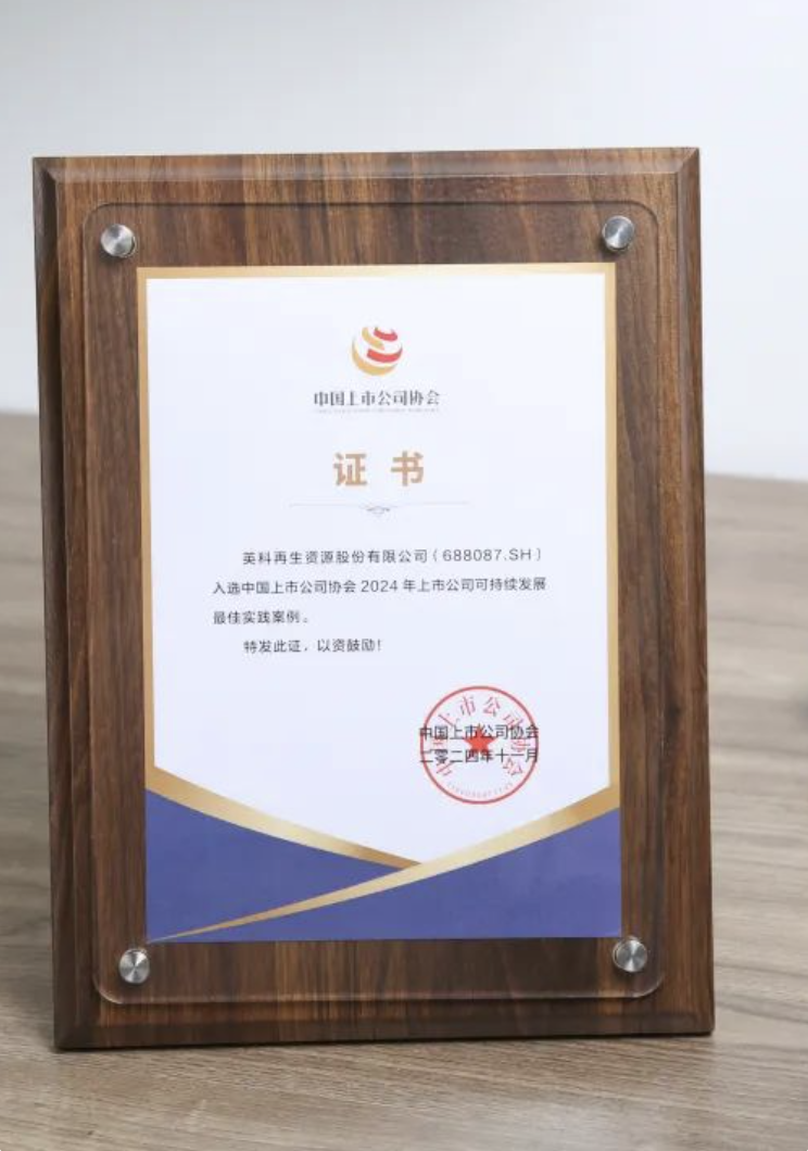 英科再生作为资源再生高科技制造商,ESG理念已经融入公司长期可持续发展战略,公司不断用实际行动践行ESG理念,在环境、社会和治理方面持续发力,积极践行“向爱、向善、求真”的核心价值观,携手利益相关方持续为社会创造可持续价值。截至目前,公司已先后取得标普全球(S&P Global)ESG Score,超过91%同行业企业;入选标普全球《可持续发展年鉴(中国版)2024》;入选彭博bloomberg ESG Score;连续两年入选中国上市公司协会ESG最佳实践案例;获评Wind ESG A级;荣膺中国证券报“新质企业金牛奖”;证券时报社“2024中国上市公司ESG百强”;全球零碳城市实践先锋奖-金级;彭博绿金ESG50年度受关注项目等重量级奖项。