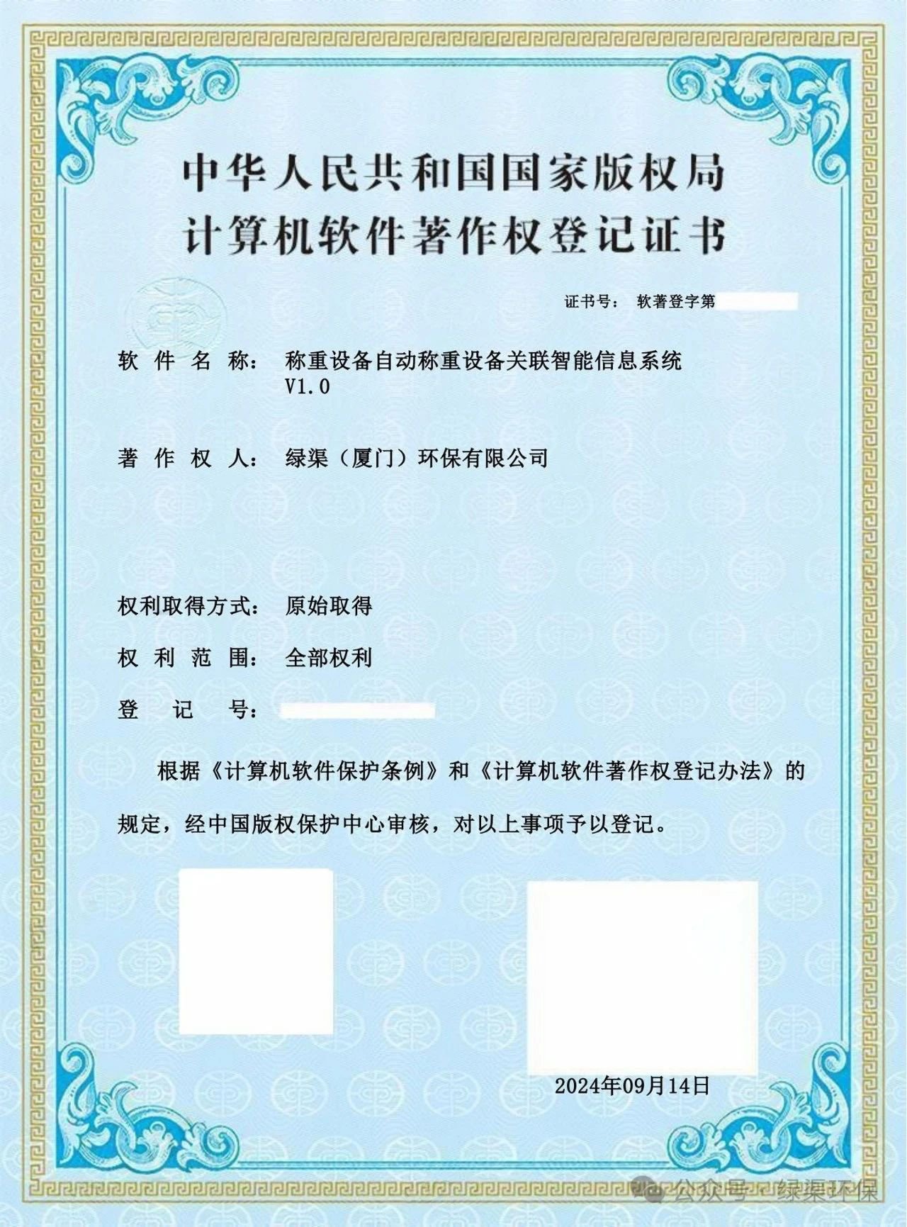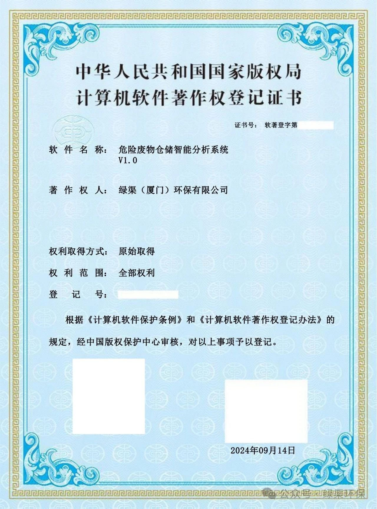 科技创新是企业高质量发展的核心驱动力,是企业能力提升和市场制胜的关键。绿渠环保坚持以固废科技创新为引领,持续突破关键技术瓶颈,掌握多项自主知识产权技术,已形成行业领先的环保科技成果。近日,绿渠环保自主研发的“一种固废仓储货架的取料设备”和“一种废料智能仓储用快速卸货装置”成功通过国家知识产权局审核并颁发《实用新型专利证书》;“称重设备自动称重设备关联智能信息系统V1.0”和“危险废物仓储智能分析系统V1.0”成功通过国家版权局审核并颁发《计算机软件著作权登记证书》,为公司推动工业固废处置技术升级、危废仓储数字化管理、实现可持续发展提供了有力的支撑。此次研发不仅成功解决了固废取料效率低/废料卸货速度慢/称重误差大等问题,更是为“无废城市”建设添砖加瓦。未来,公司将继续以创新驱动环保产业发展,书写绿色发展的辉煌新篇章!