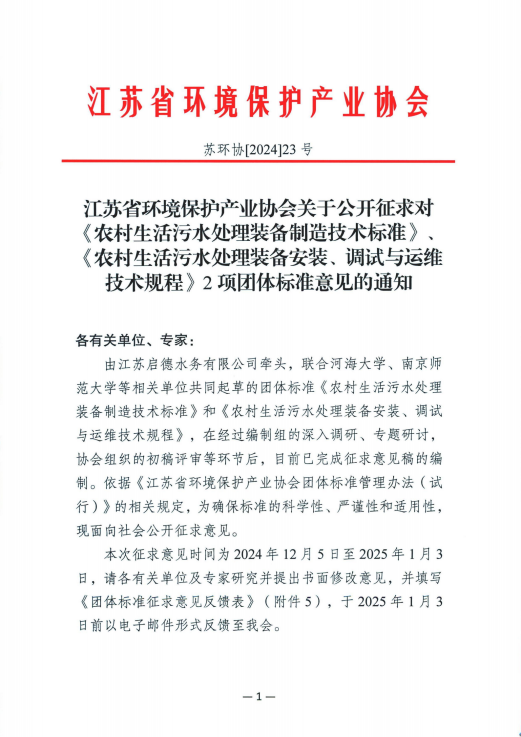 自5月29日起,由省环保集团产业公司所属江苏启德水务有限公司(以下简称“启德公司”)牵头,联合河海大学、南京师范大学起草的团体标准——《农村生活污水处理装备制造技术标准》和《农村生活污水处理装备安装、调试与运维技术规程》正式实施。这两项标准的发布,标志着启德公司在农村生活污水处理装备制造和建设领域的技术创新和行业引领方面取得重要突破,为江苏省乃至全国的农村生活污水治理提供了系统性的技术规范。