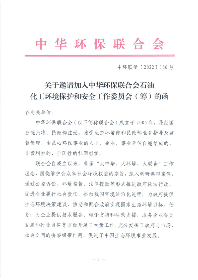 关于邀请加入中华环保联合会石油化工环境保护和安全工作委员会(筹)的函