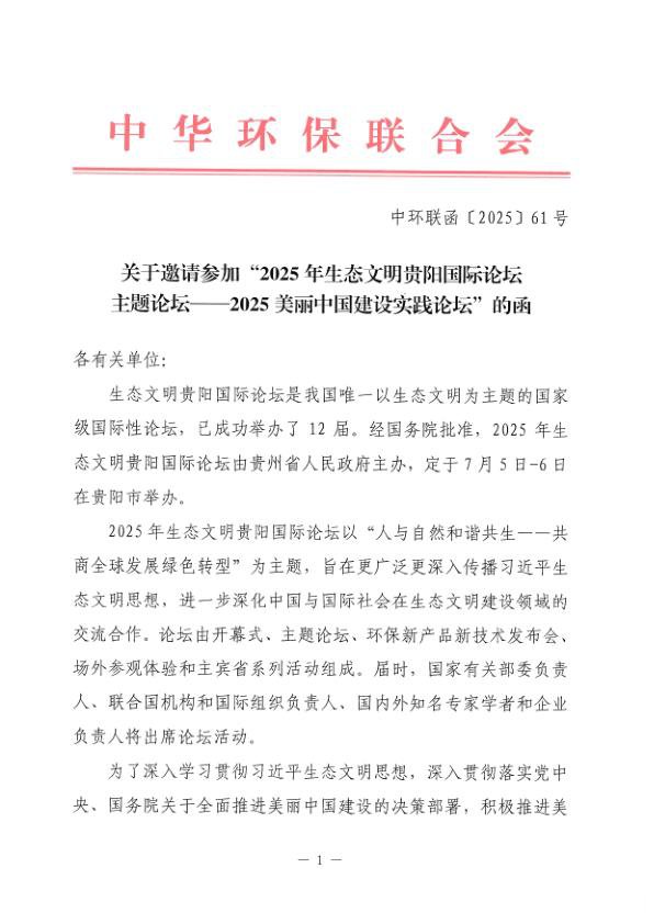 为了深入学习贯彻习近平生态文明思想,深入贯彻落实党中央、国务院关于全面推进美丽中国建设的决策部署,积极推进美丽中国建设实践,探索美丽中国建设路径,中华环保联合会拟于7月6日以生态文明贵阳国际论坛主题论坛的形式举办“2025美丽中国建设实践论坛”。