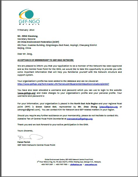 今年2月我会成为全球环境基金NGO网络(GEF-NGO Network)的会员。