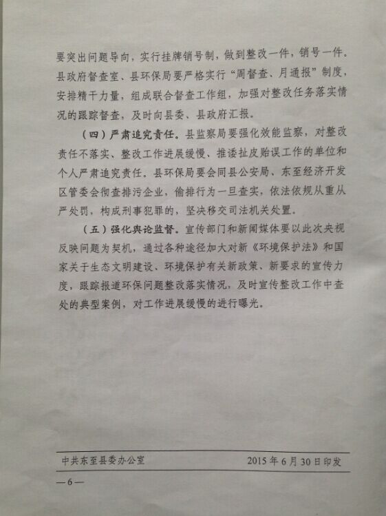 2015年5月,我会联合中央电视台对安徽省池州市东至县香隅化工园环境问题进行了联合调研,调研发现园区排放的工业废水中苯含量超标136倍,对附近的灌溉河道造成污染,并对下游长江的水质安全构成威胁。6月17日,央视《新闻直播间》对该环境问题进行了曝光,引起了当地政府的高度重视,“池州市委市政府要求东至县立即做出整改,园区全部37家企业立即全部自查整改,通河两岸8家涉苯企业立即停产整顿,加快推进园区雨污分流系统治理工程进度,从源头上彻底杜绝污水排放的问题”。7月3日,东至县人民政府向我会发来《东至经济开发区环保问题整改工作实施方案》,方案对经开区环保问题制定了整改目标和具体工作任务完成时序,并落实了保障措施。