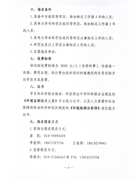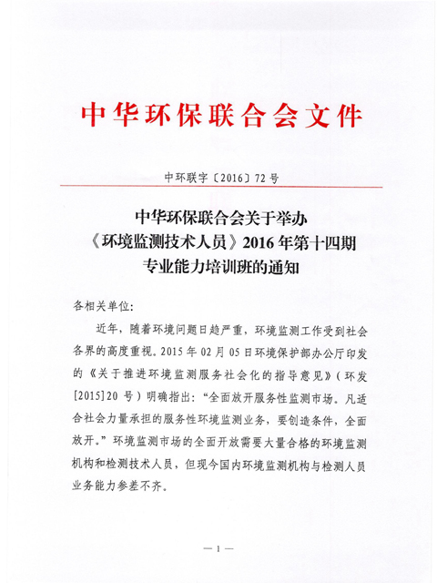 中华环保联合会关于举办《环境监测技术人员》2016年第十四期专业能力培训班的通知