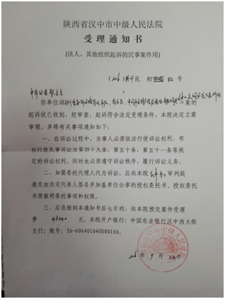 2016年9月22日,中华环保联合会人员同陕西法正平安律师事务所律师赴陕西省汉中市,正式向汉中市中级人民法院递交中华环保联合会起诉延川县永坪石油货运车队、高小飞、中国平安财产保险股份有限公司延安中心支公司环境污染民事公益诉讼起诉材料,汉中市中级人民法院立案庭法官审核后,出具了《受理通知书》。