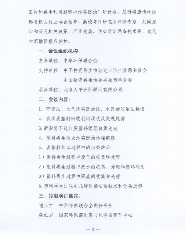 中华环保联合会关于开展“塑料回收和再生利用过程中污染防治”研讨会的通知