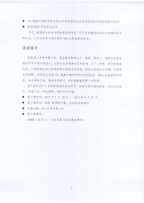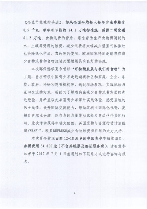 中华环保联合会关于举办“减少食物浪费-赴瑞典环保游学夏令营”的通知
