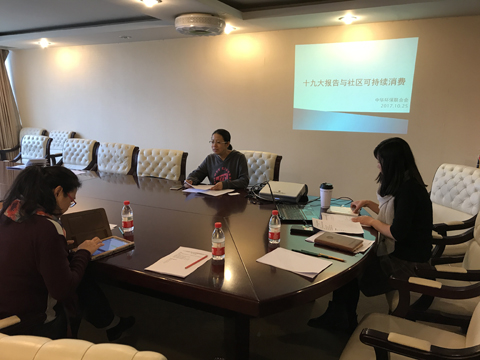 10月25日,在“十九大”圆满闭幕之际,我会国际部专门组织召开“‘十九大’新形势下推动社区可持续消费建设研讨会”。会议旨在围绕十九大报告中关于推进绿色社区、绿色生产生活方式的系列重要精神,探讨及确立今后推动绿色社区可持续消费的重点议题与工作方向、开发可持续消费工作者能力建设培训教材、并探索建立推动绿色社区建设的多方长效参与机制。环境保护部宣教中心公共关系与战略传播研究所副所长杨珂,清华大学社会学系研究员吕岩、北京市朝阳区社区工作者代表以及我会国际部全体人员参加会议。会议由我会国际部负责人主持。