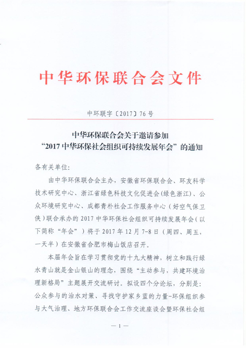 由中华环保联合会主办,安徽省环保联合会、环友科学技术研究中心、浙江省绿色科技文化促进会(绿色浙江)、公众环境研究中心、成都青朴社会工作服务中心(好空气保卫侠)联合承办的2017中华环保社会组织可持续发展年会(以下简称“年会”)将于2017年12月7-8日(周四、周五,一天半)在安徽省合肥市梅山饭店召开。