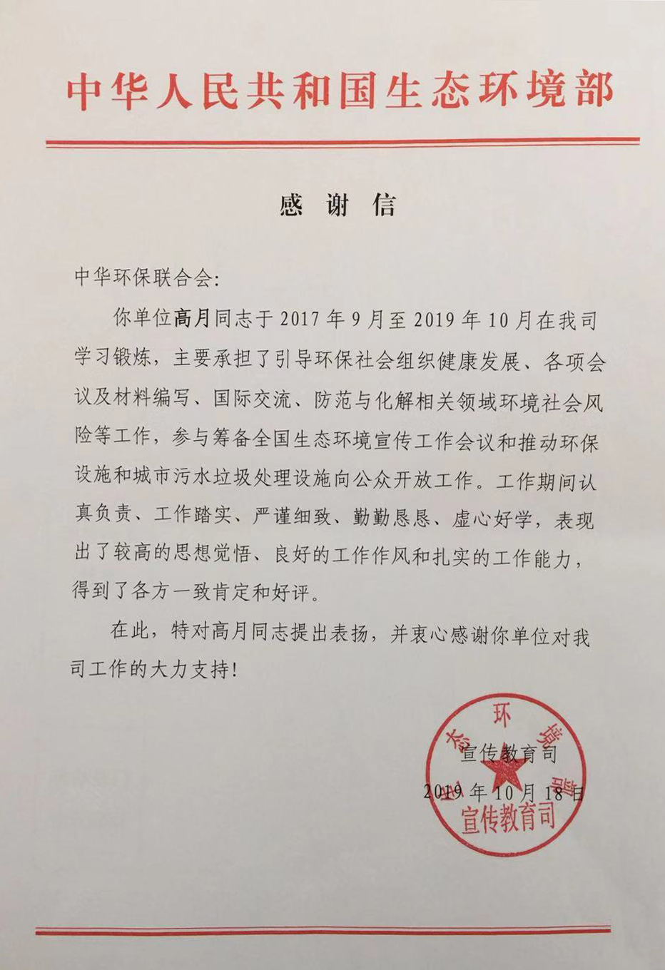 我会高月同志于2017年9月,借调到环保部宣传教育司帮助工作,该同志工作认真负责、勤勉敬业、严谨细致、踏实肯干,得到了宣教司领导和同事们的一致肯定和好评。2019年10月18日,宣教司专门向我会发来感谢信。内容如下: