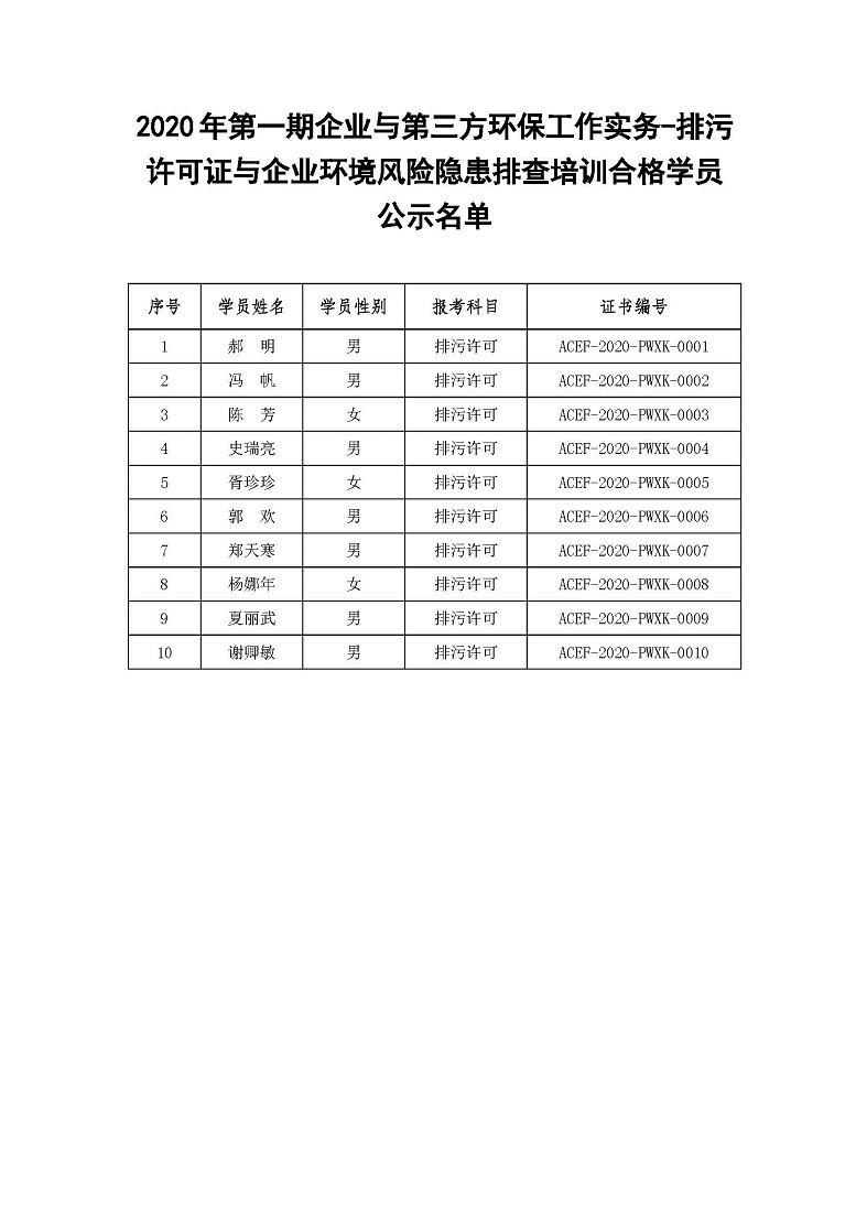 2020年第二期环保管家生态环境服务产业创新升级培训及2020年第一期排污许可证与企业环境风险隐患排查培训合格学员公示名单