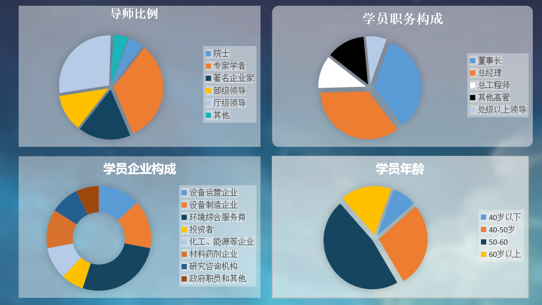 学员来自全各国地,覆盖环保产业各个领域,层次高。定期组织同学交流活动,分区域组建各地学习组,促进同学间的交流与合作,为学员搭建高层次的人脉资源。