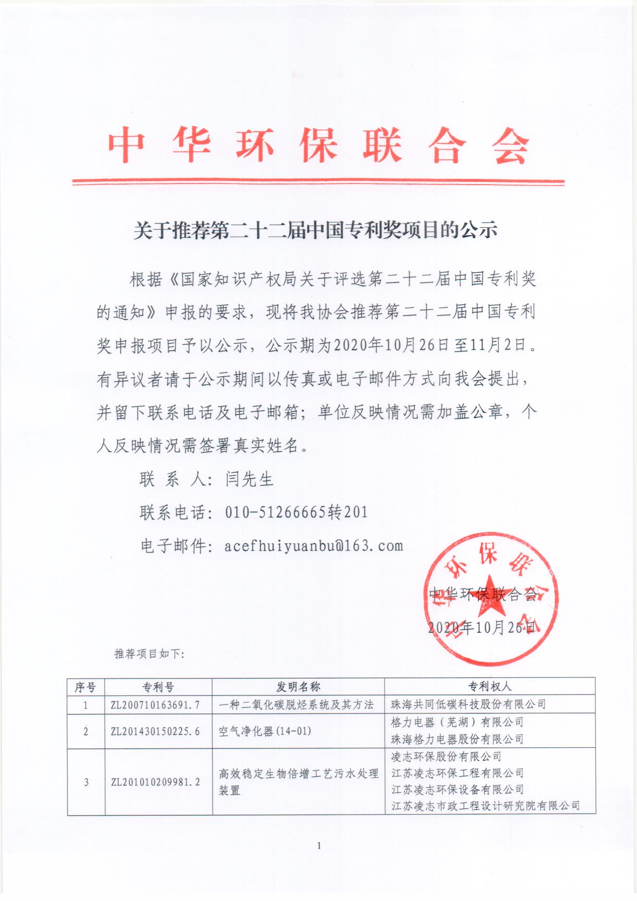 关于推荐第二十二届中国专利奖项目的公示