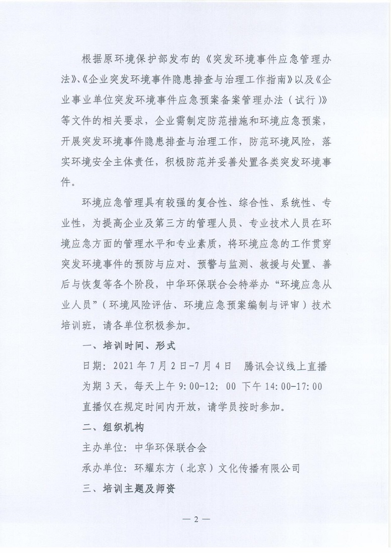 关于举办2021年第6期“环境应急从业人员”(环境风险评估、环境应急预案编制与评审)技术培训班的通知