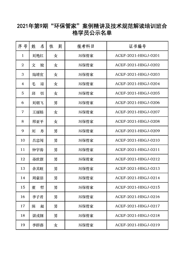 2021年第9期“环保管家”案例精讲及技术规范解读培训班合格学员公示