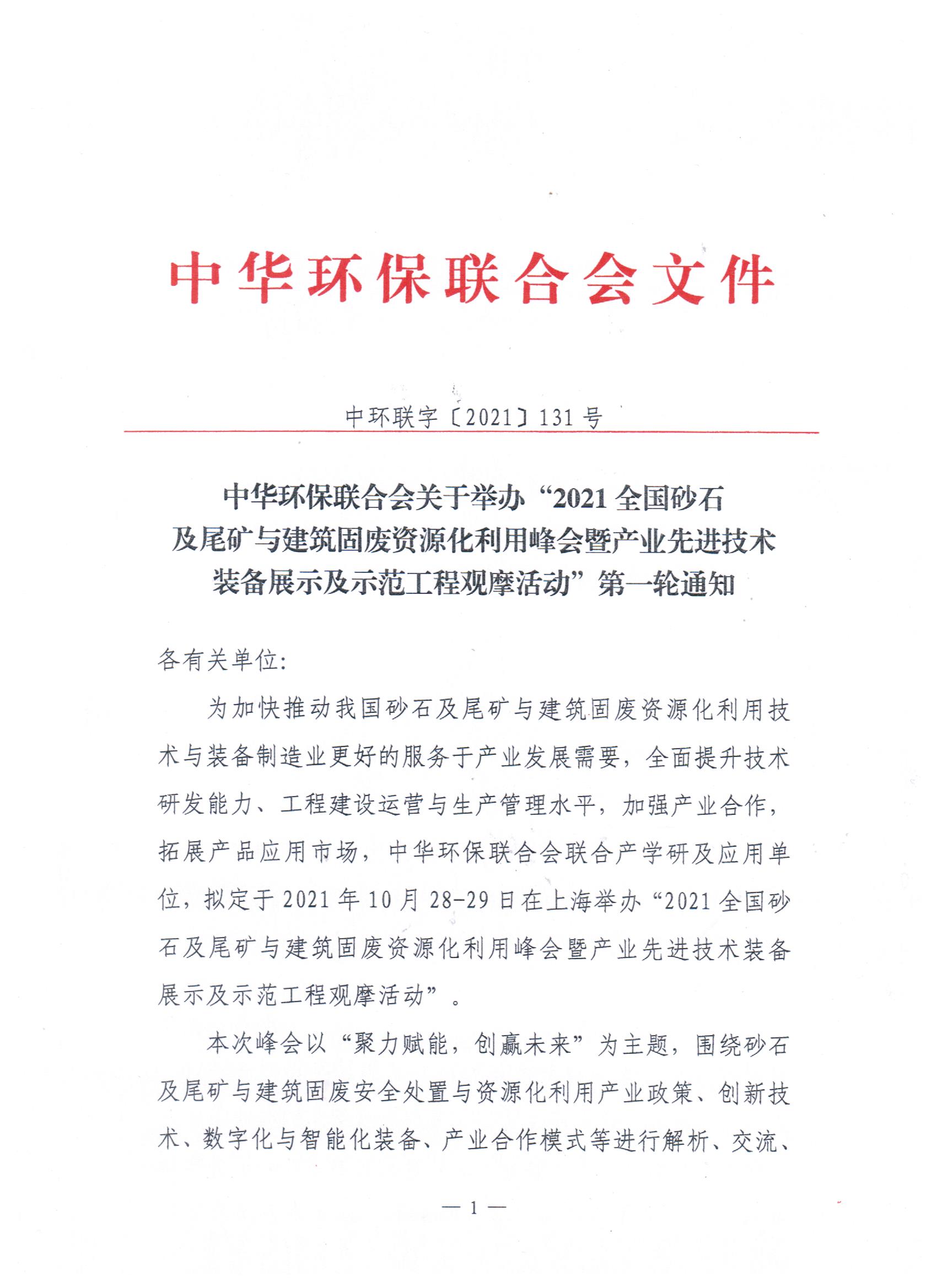 关于举办“2021全国砂石及尾矿与建筑固废资源化利用峰会暨产业先进技术装备展示及示范工程观摩活动”第一轮通知