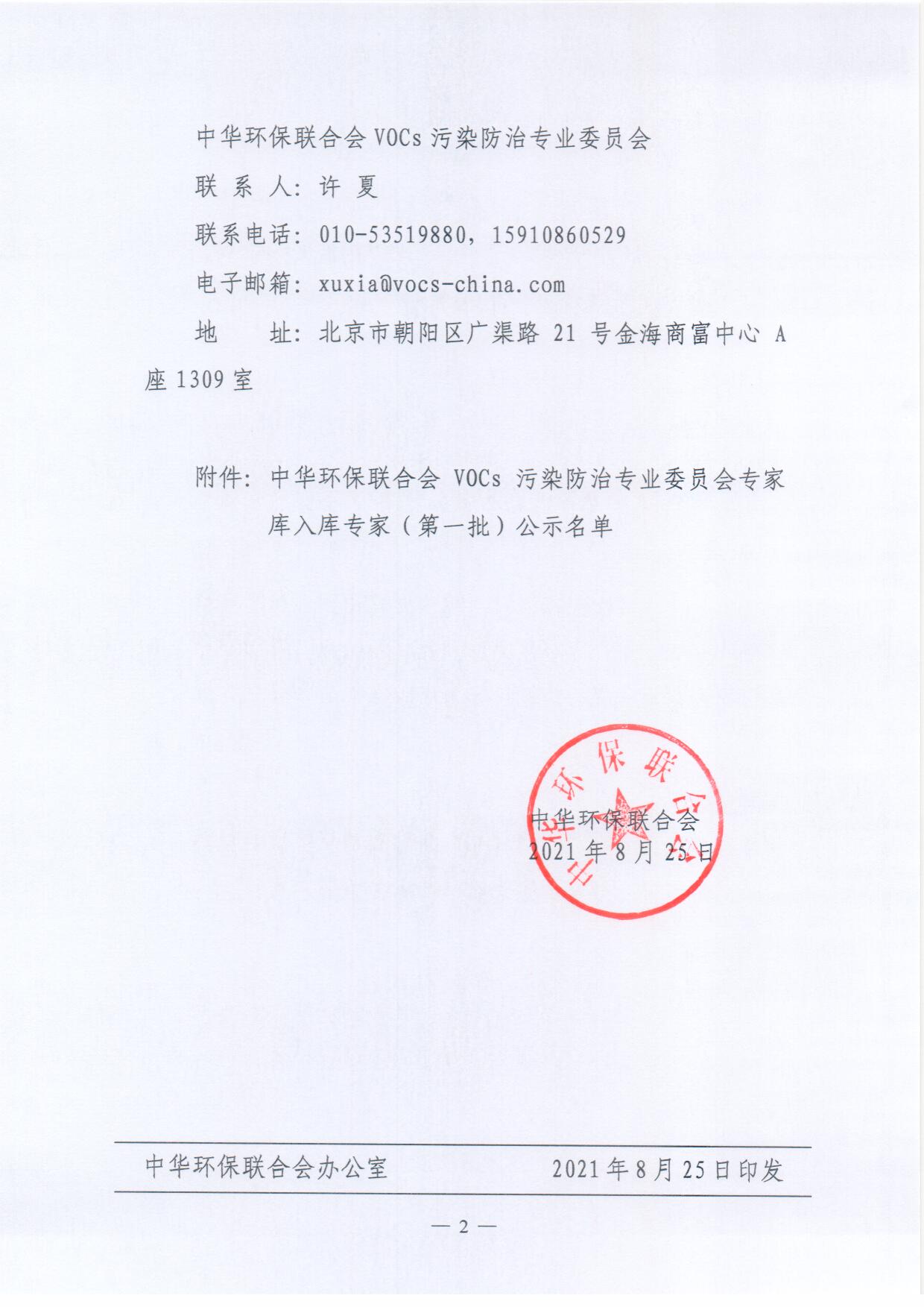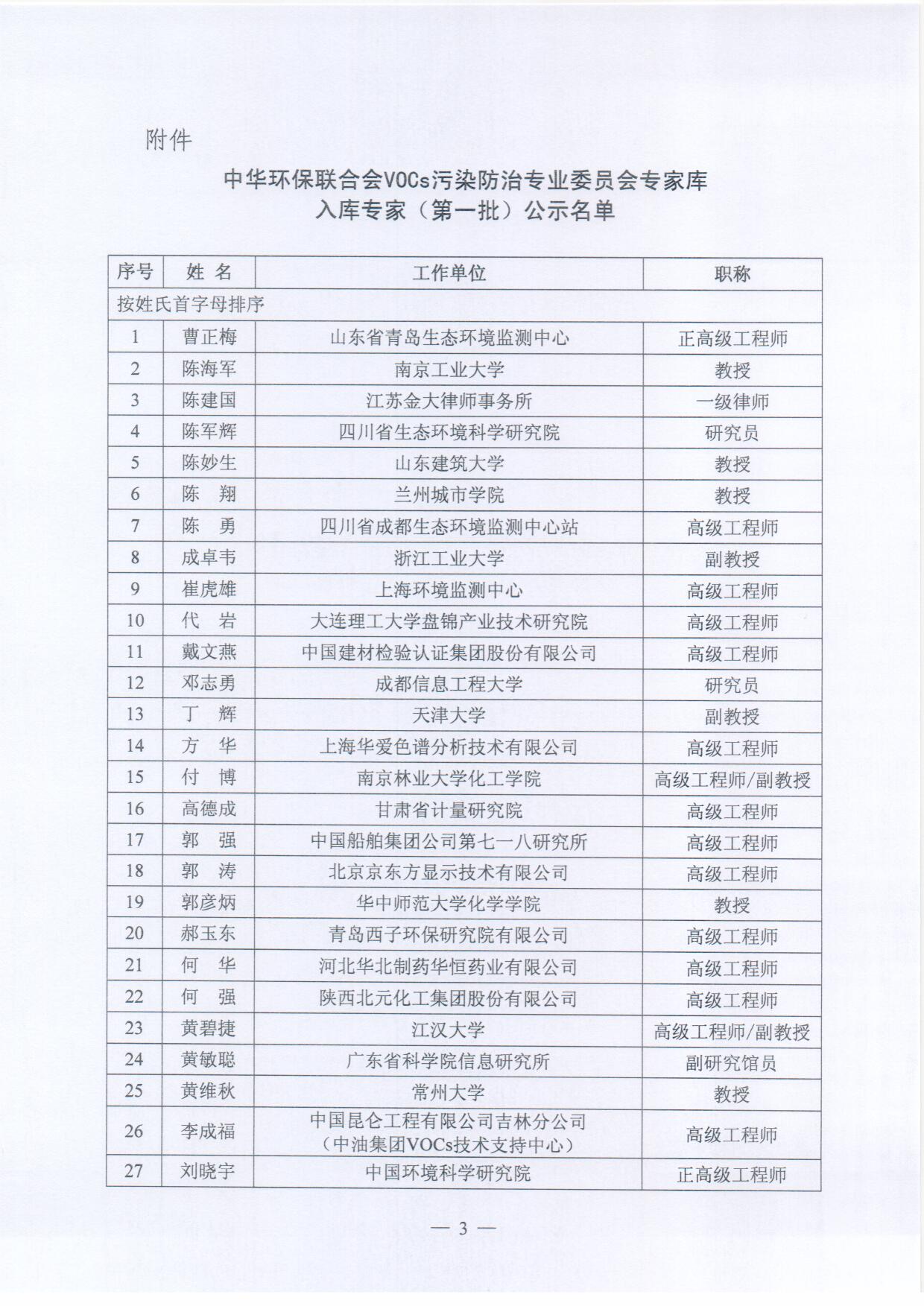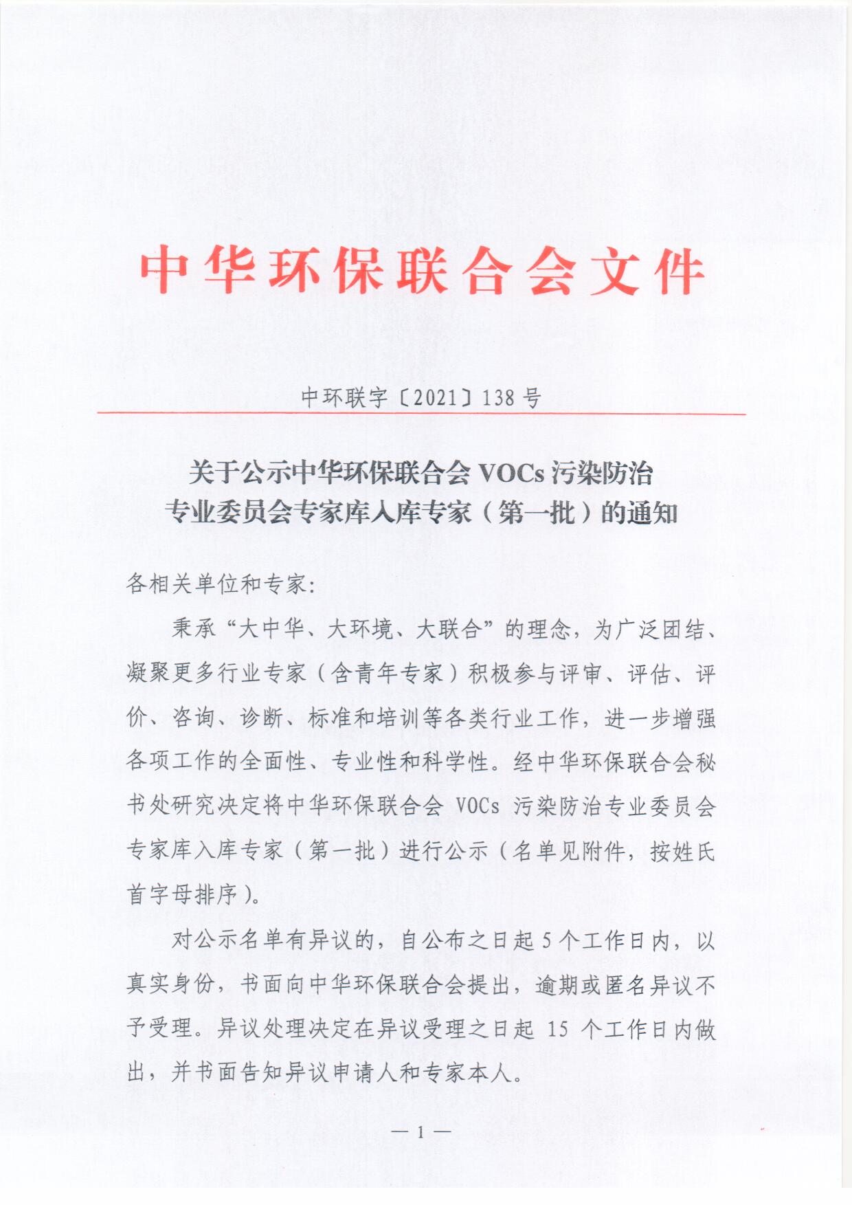 关于公示中华环保联合会VOCs污染防治专业委员会专家库入库专家(第一批)的通知